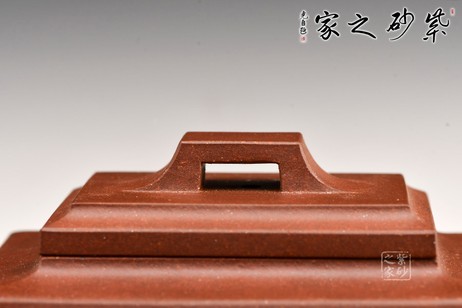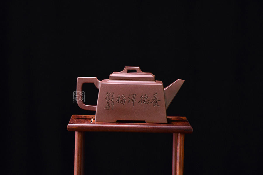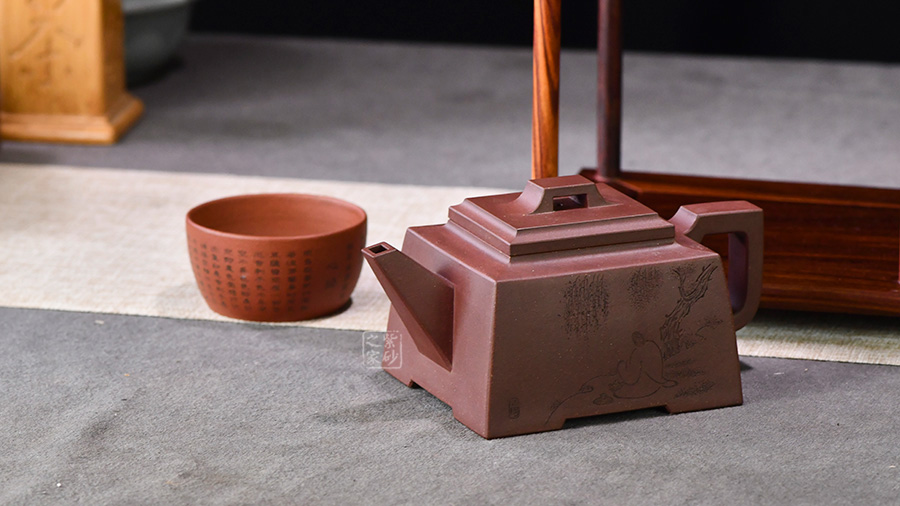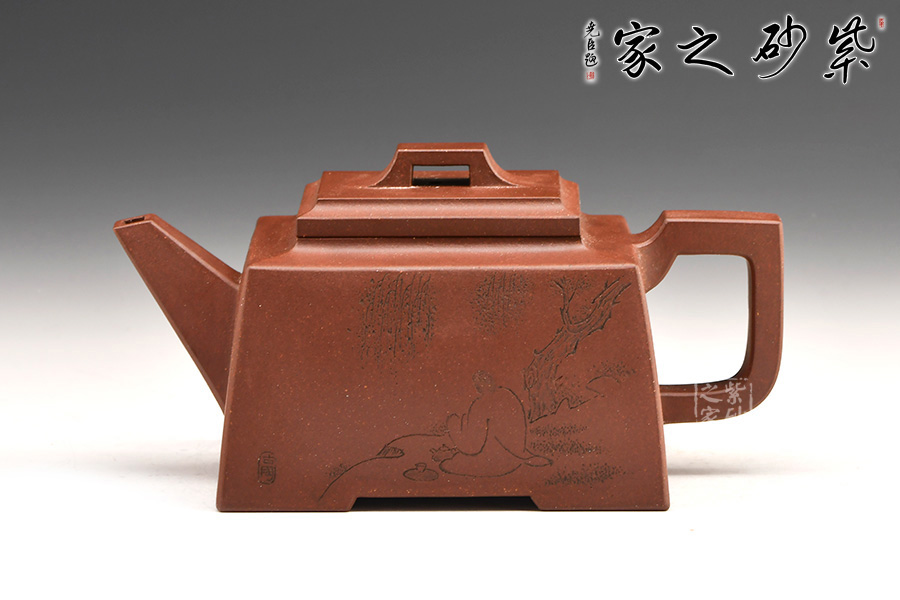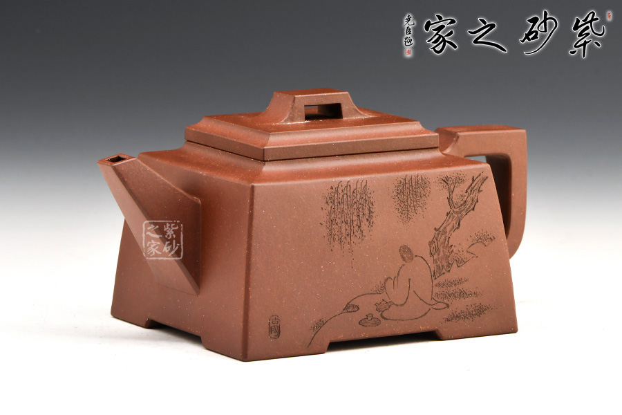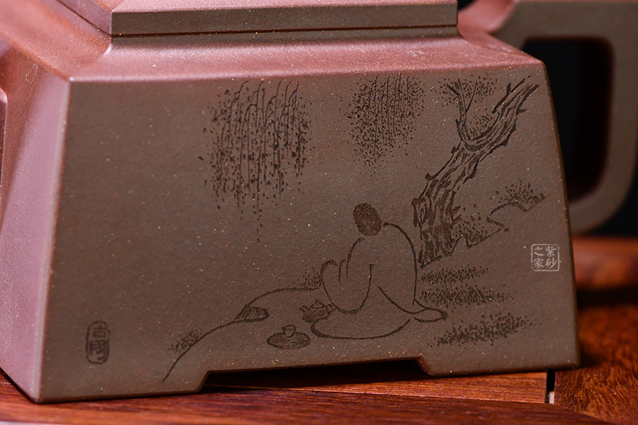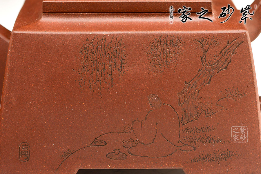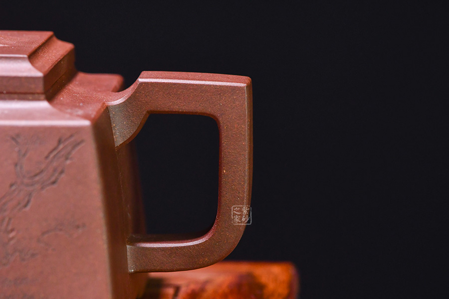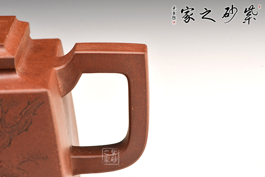 四方橋頂工藝難度頗大,橋形鈕。方形壺身,壺把,壺蓋,流、把亦呈四方不規(guī)則型。線條清晰分明,型制周正,工藝純熟。壺身刻繪有一種寧靜平和之感,中和了方器的鋒利,使得方壺剛?cè)峤Y(jié)合,更有韻味。
