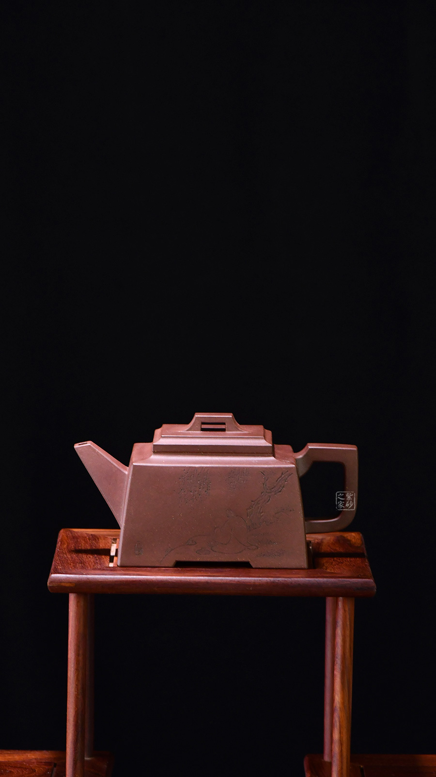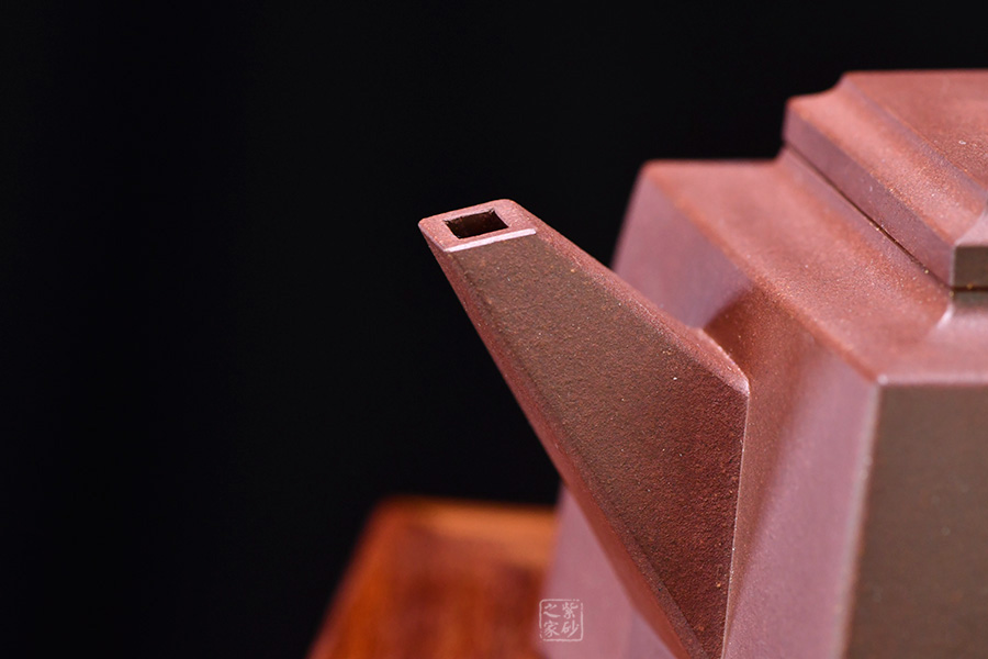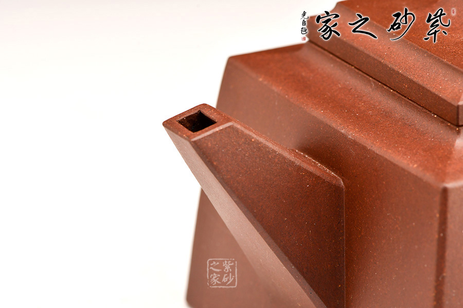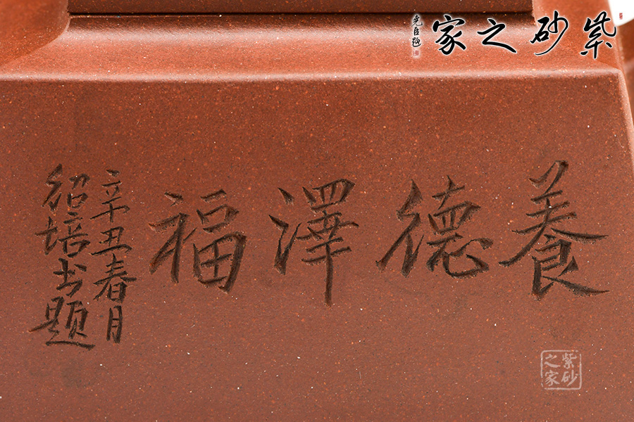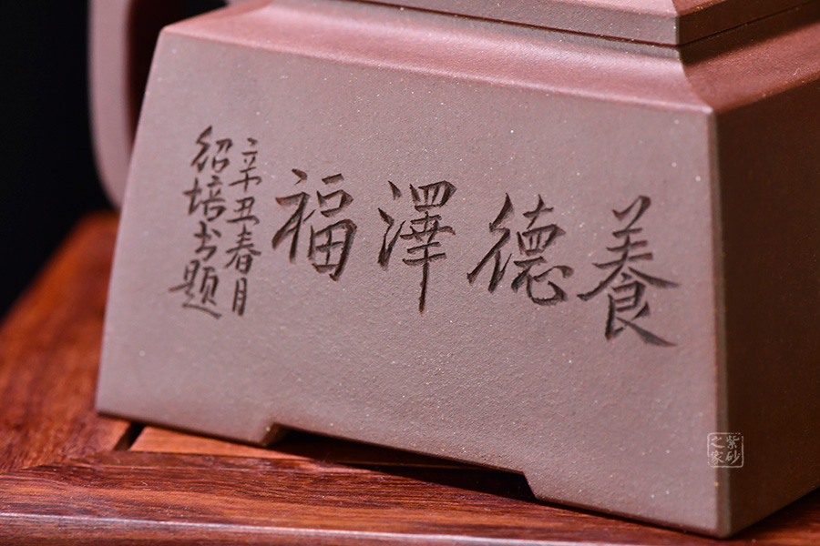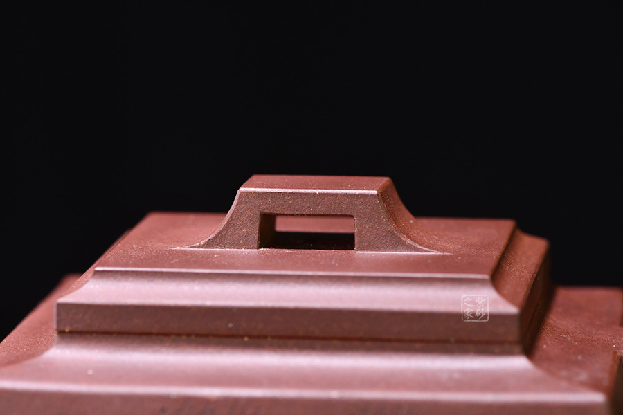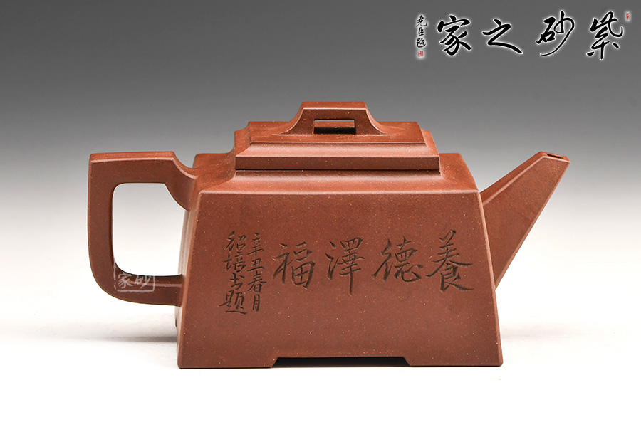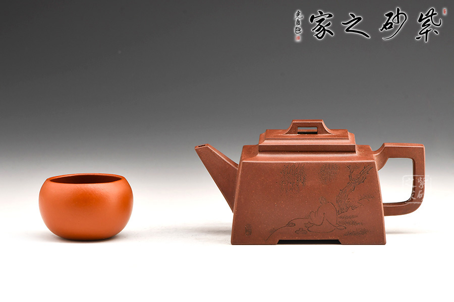 四方橋頂工藝難度頗大,橋形鈕。方形壺身,壺把,壺蓋,流、把亦呈四方不規(guī)則型。線條清晰分明,型制周正,工藝純熟。壺身刻繪有一種寧靜平和之感,中和了方器的鋒利,使得方壺剛?cè)峤Y(jié)合,更有韻味。