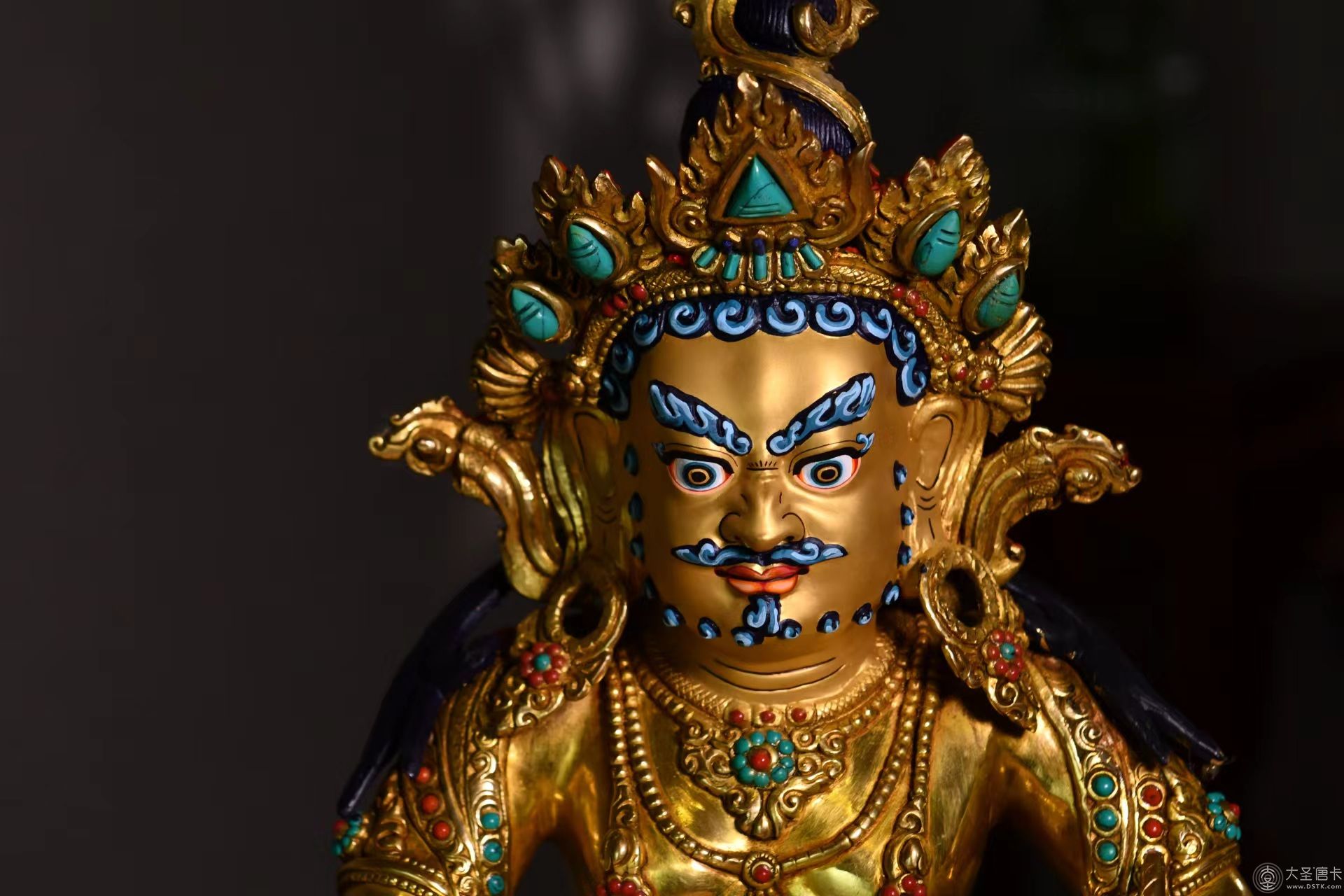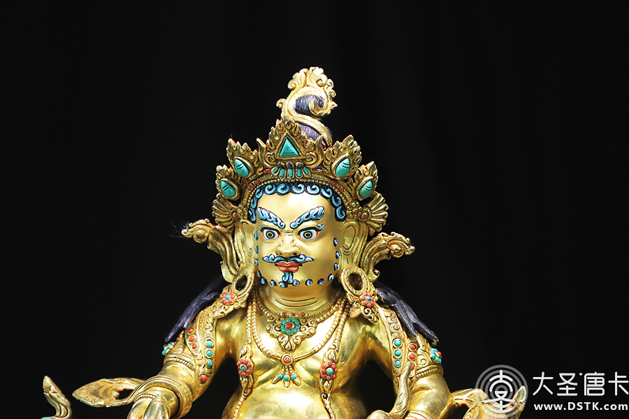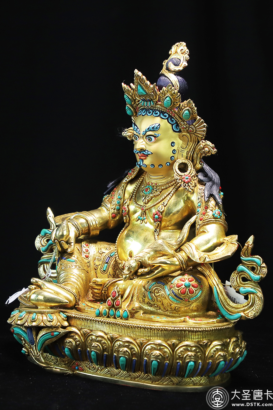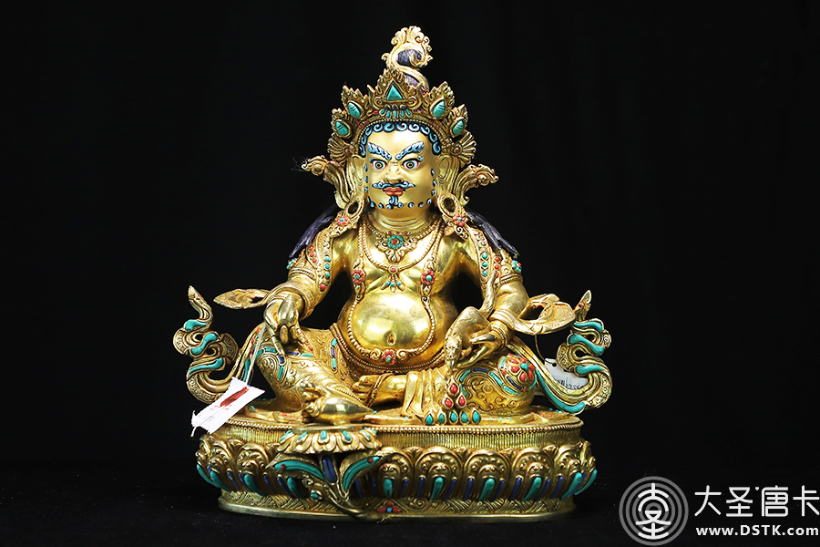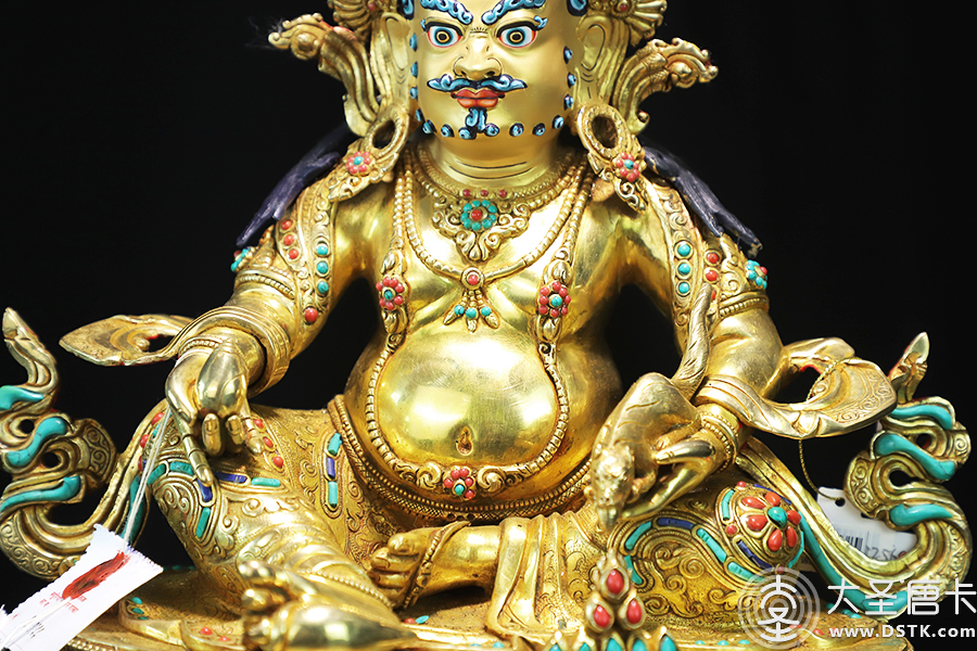 黃財(cái)神的形象為上身袒露,下身著裙,右手持摩尼寶,象征寶光普照十方,增添眾生的福報(bào);左手抱一只大貓鼬(吐寶鼠),鼬的嘴里含著珠寶,象征財(cái)寶。右腳踏一只白色海螺,象征著他能入海取寶。