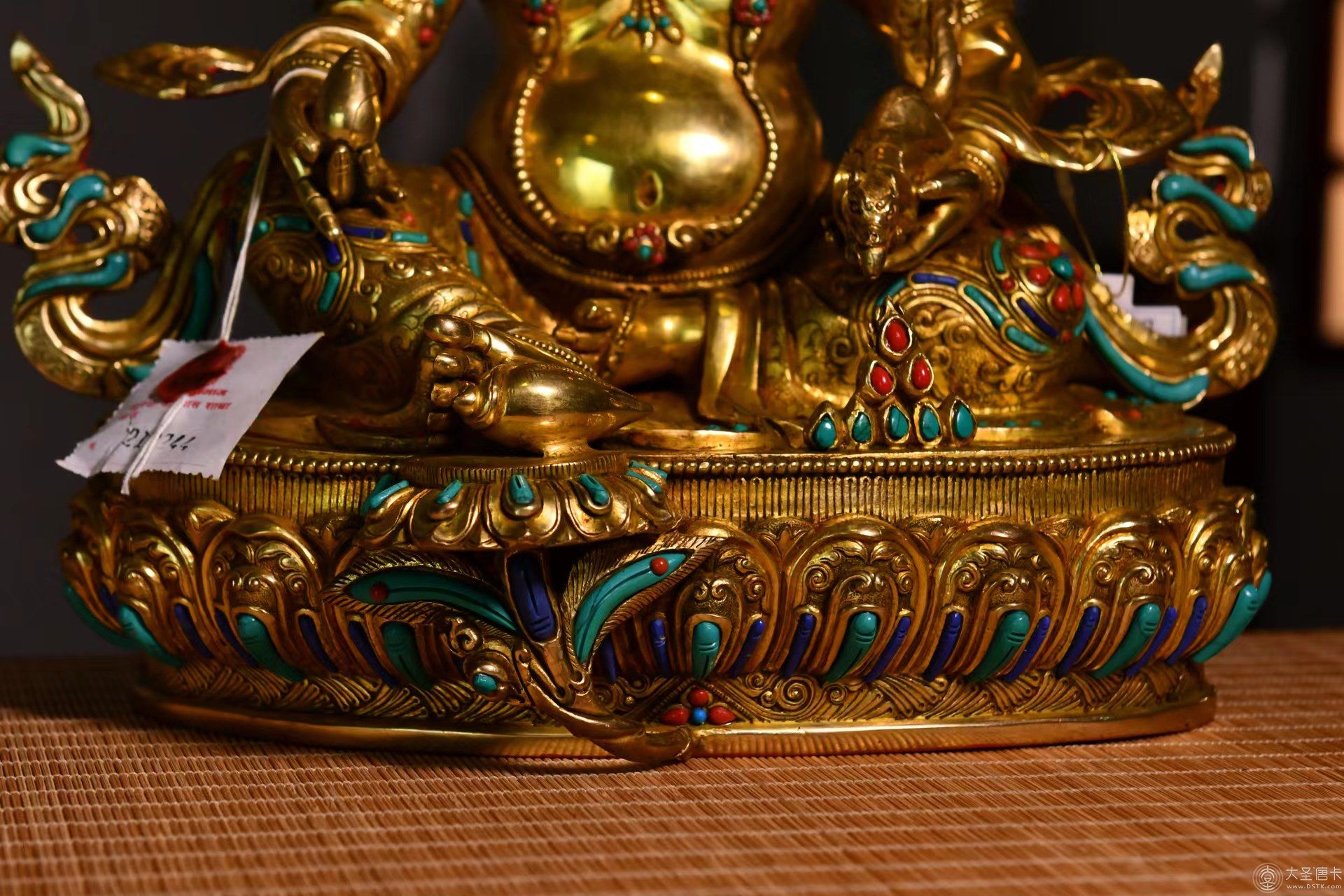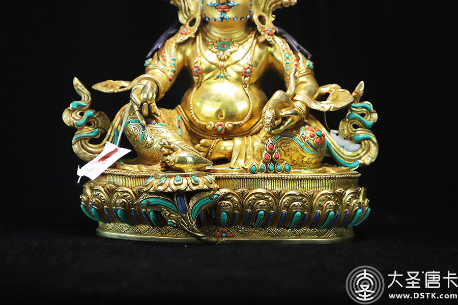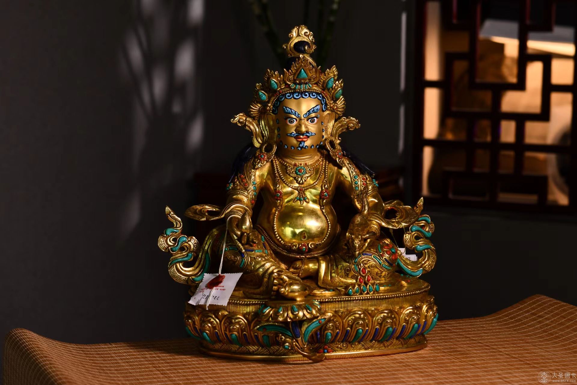 黃財(cái)神的形象為上身袒露,下身著裙,右手持摩尼寶,象征寶光普照十方,增添眾生的福報(bào);左手抱一只大貓鼬(吐寶鼠),鼬的嘴里含著珠寶,象征財(cái)寶。右腳踏一只白色海螺,象征著他能入海取寶。
