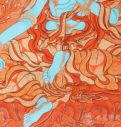 在繪制佛像服飾等位置時(shí),用刻金技法,使圖案更具豐富的層次和立體感,用金勾勒的線條和圖案不但明亮度進(jìn)一步提高,讓畫面更加燦爛,而且也使金在畫面上保持得更加長(zhǎng)久。