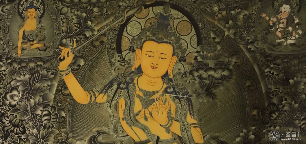文殊菩薩為諸佛、諸菩薩之師,是大智慧的象征,智慧無(wú)雙,有開(kāi)悟明智的加持力。通常手持慧劍,騎乘獅子,比喻以智慧利劍斬?cái)酂?,以獅吼威風(fēng)震懾魔怨。