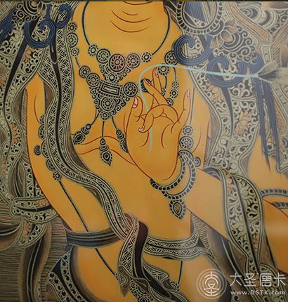 在繪制佛像服飾等位置時(shí),用刻金技法,使圖案更具豐富的層次和立體感,用金勾勒的線條和圖案不但明亮度進(jìn)一步提高,讓畫面更加燦爛,而且也使金在畫面上保持得更加長(zhǎng)久。
