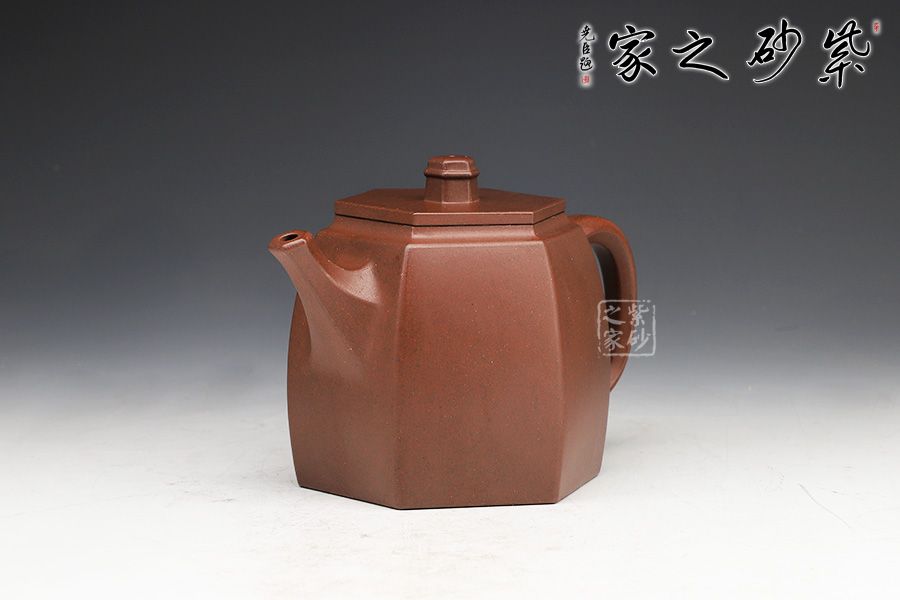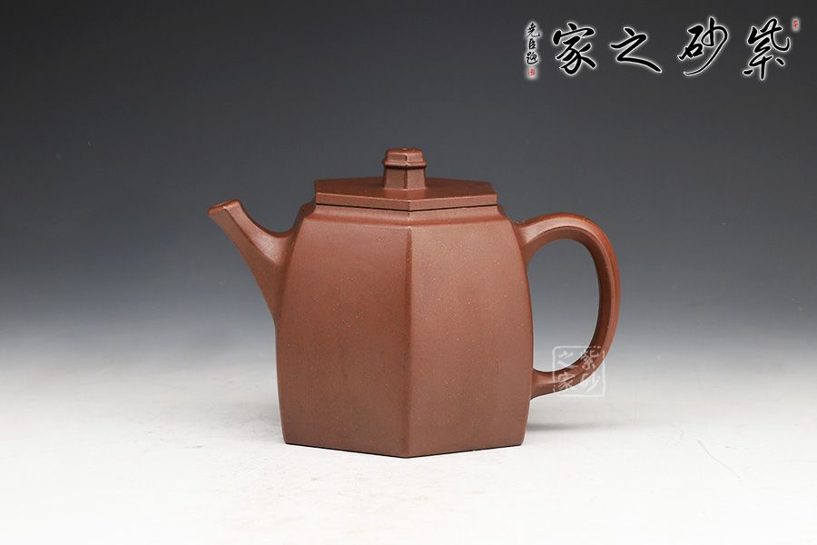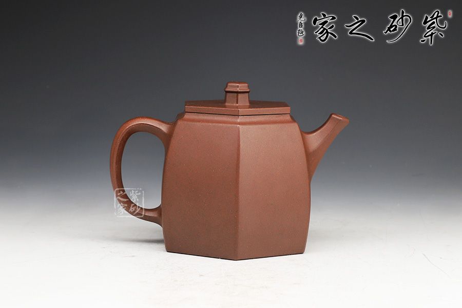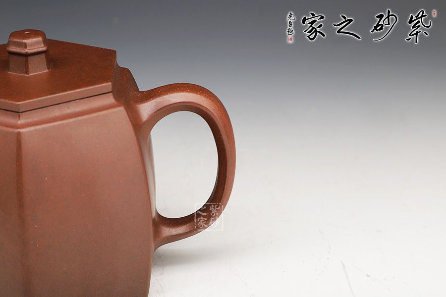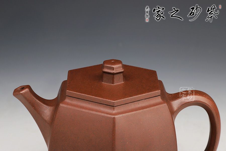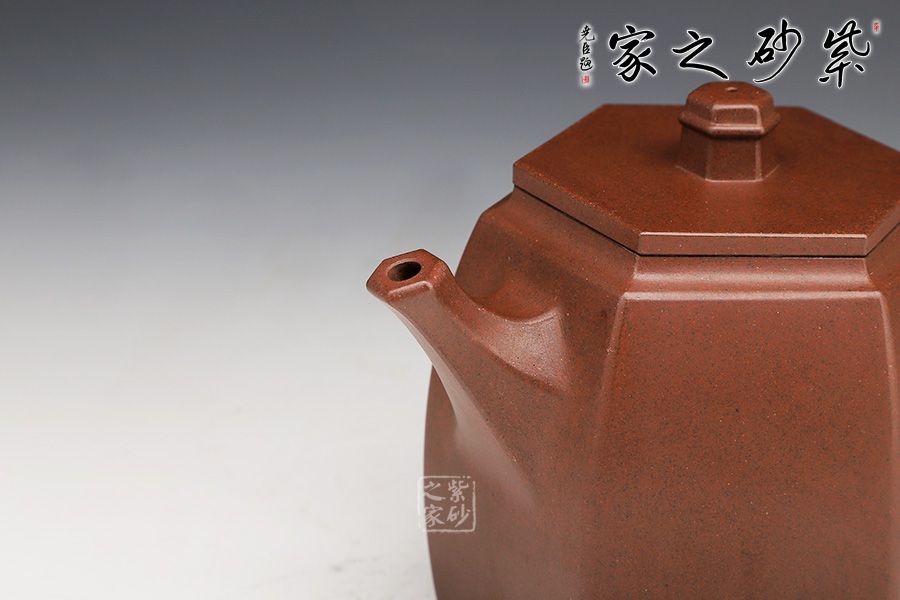 此壺在經(jīng)典漢鐸的基礎(chǔ)上加入了六方的型制,造型規(guī)整,壺身如鐘,氣勢(shì)浩然。平嵌蓋,與壺融為一體,柱形鈕,短直流,耳形方把,形筒古樸,整器亦樸亦雅。