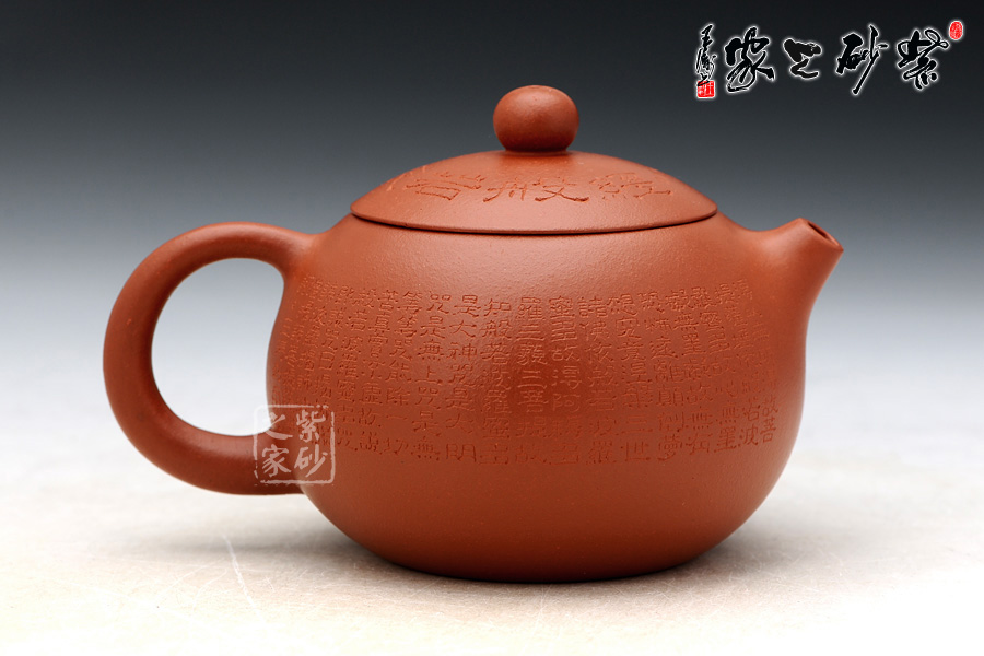 王老師的一個(gè)遠(yuǎn)房表姐信佛,一日去探望,表姐說(shuō)到:弟弟,你看能不能給我這個(gè)信佛的老姐姐作一個(gè)壺,帶經(jīng)文的?以便我在泡茶時(shí)也能有心向佛。老師遂選擇泥料、選定款型、制作、刻繪、燒成,于是心經(jīng)西施問(wèn)世。