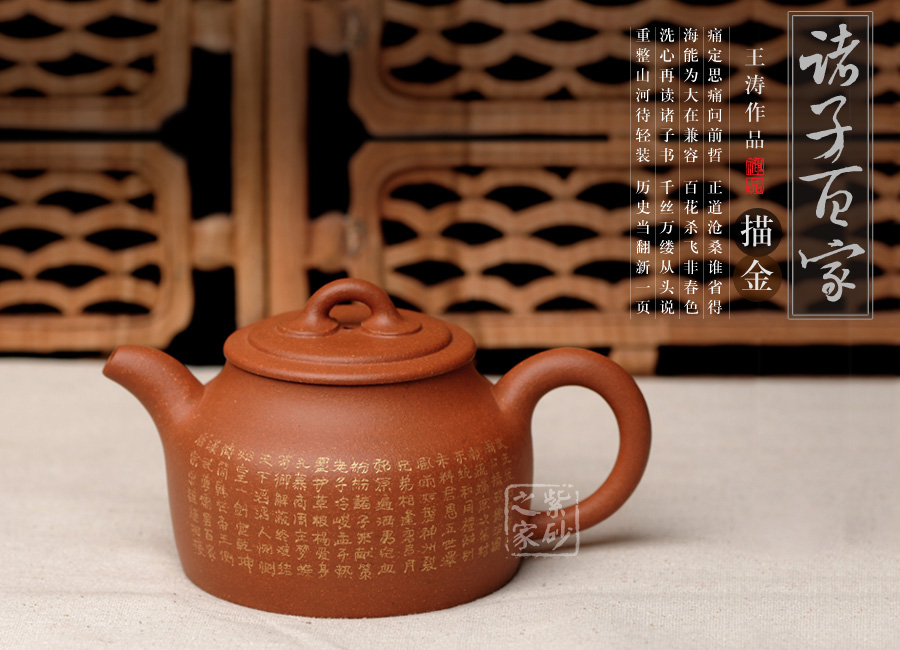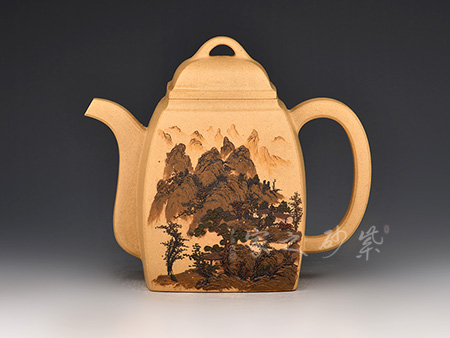 詩(shī)畫(huà)饋贈(zèng),領(lǐng)略文人之風(fēng):其作品多以厚重的文化底蘊(yùn)和精巧的刻繪工藝見(jiàn)長(zhǎng),這得益于其對(duì)書(shū)畫(huà)的極高造詣,一字一景耐人品評(píng),若能解其中之味,便能一語(yǔ)道破壺中天機(jī)。不時(shí) 有題詞或畫(huà)作贈(zèng)予壺友,互相交流學(xué)習(xí)。王濤之壺,文人之壺,茶香和著詩(shī)韻,乃是壺的精髓所在。近年來(lái)的紫砂作品傳統(tǒng)為主,力圖創(chuàng)新,具有鮮明的個(gè)性和文化特征。