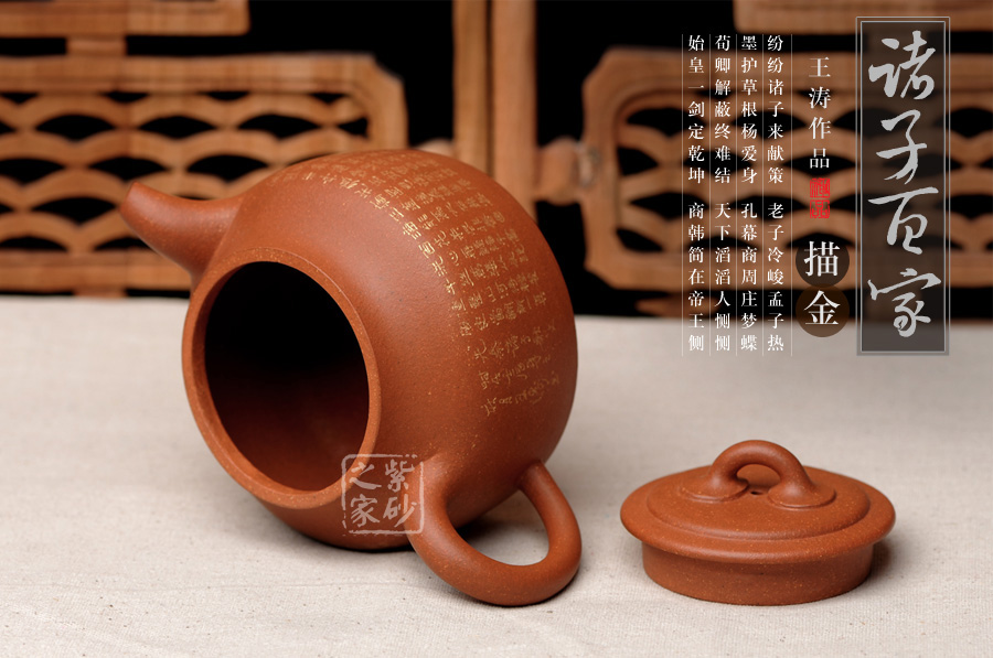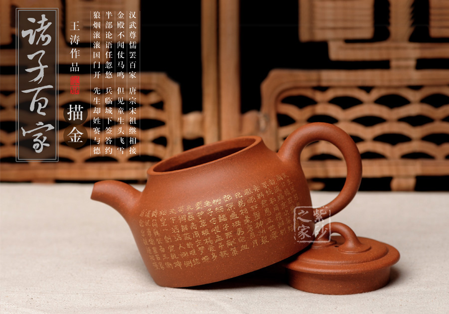壺身刻繪為“先秦諸子歌”,用實(shí)在的諸子百家文化解說(shuō)壺的深意,字體刻繪規(guī)整凝練,描黑工藝更添文化氛圍