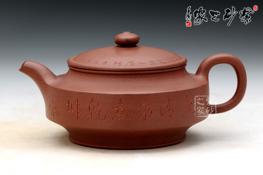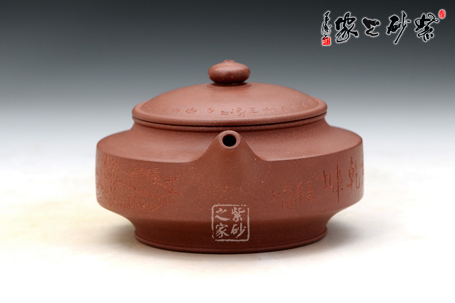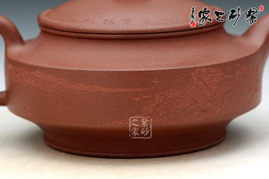 君之風(fēng)以周盤壺為原型,關(guān)于周盤壺的來(lái)源,喜歡 此款壺的朋友必定明白,曼生喜好夜讀,每每捧卷至深夜,間或倦怠,品茶以緩之,閉目靜思:十年寒窗無(wú)人曉,一舉成名天下知,而其中艱辛唯有自己能夠體味, 更何況為官處世為自保有時(shí)不免強(qiáng)己所難……思之不免惆悵,起身信步,恰見置于小桌之羅盤,隨手撥弄,見其勺柄經(jīng)由其轉(zhuǎn),卻始終如一,指向一方。曼生感嘆, 羅盤雖如銅勺,表面圓通,卻堅(jiān)持己見,曲直合一乃為人之道也。遂以羅盤為原型,繪壺以省之,名曰周盤。壺身正面篆刻的是“一壺清泉煮乾坤”,訴說(shuō)著茶文化的博大精深;壺身反面篆刻的是自然山水風(fēng)景。