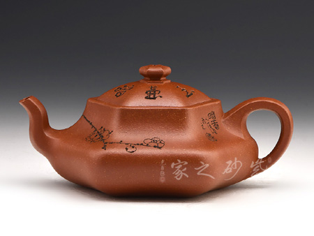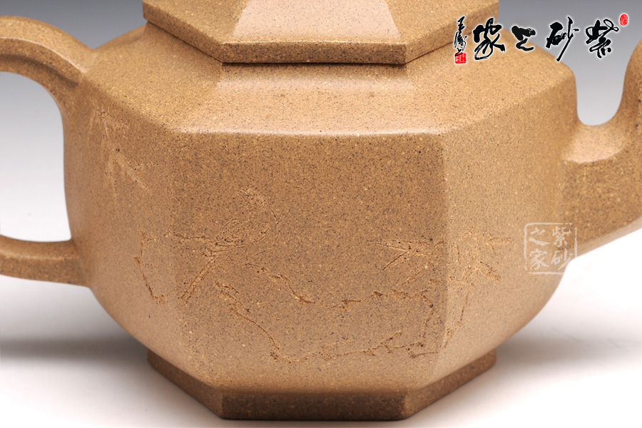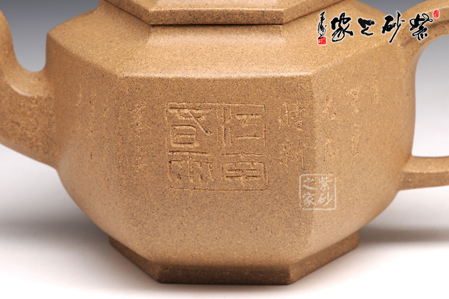 壺身正面篆刻的是“江南春雨”四個(gè)字,四字錯(cuò)落有致,字體優(yōu)雅細(xì)膩,令人賞心悅目,六方造型精湛,起承轉(zhuǎn)合之間恰到好處