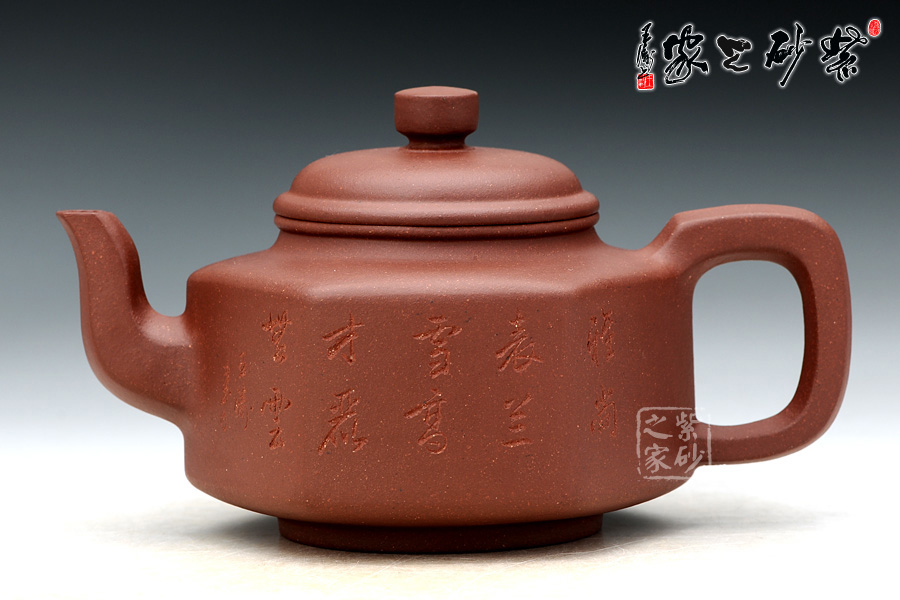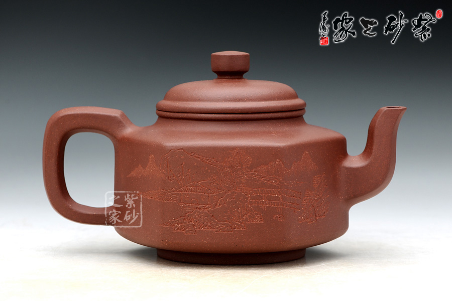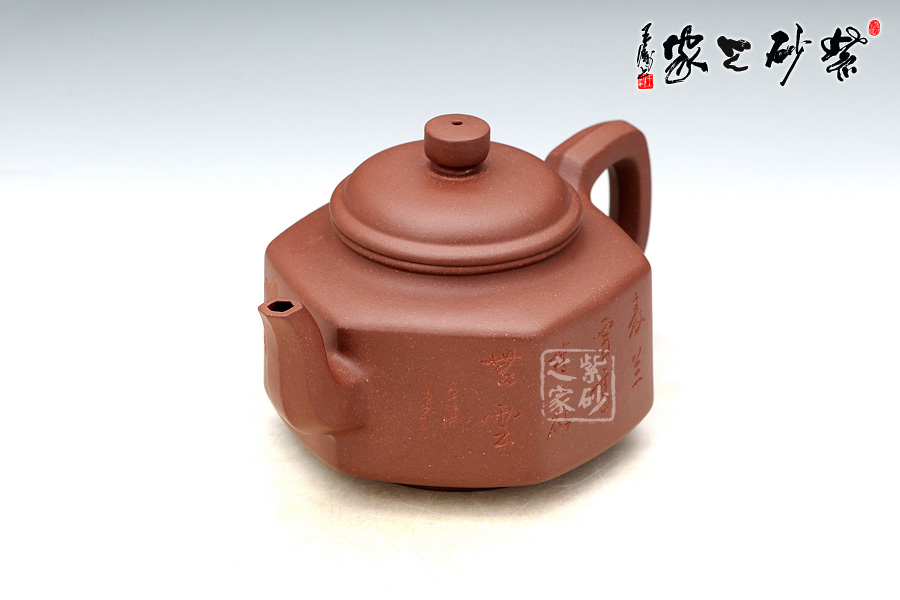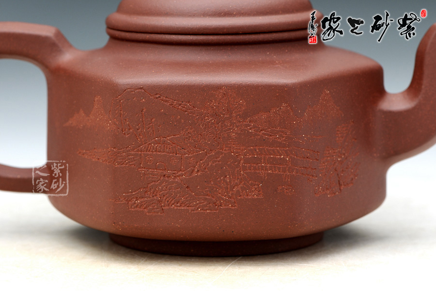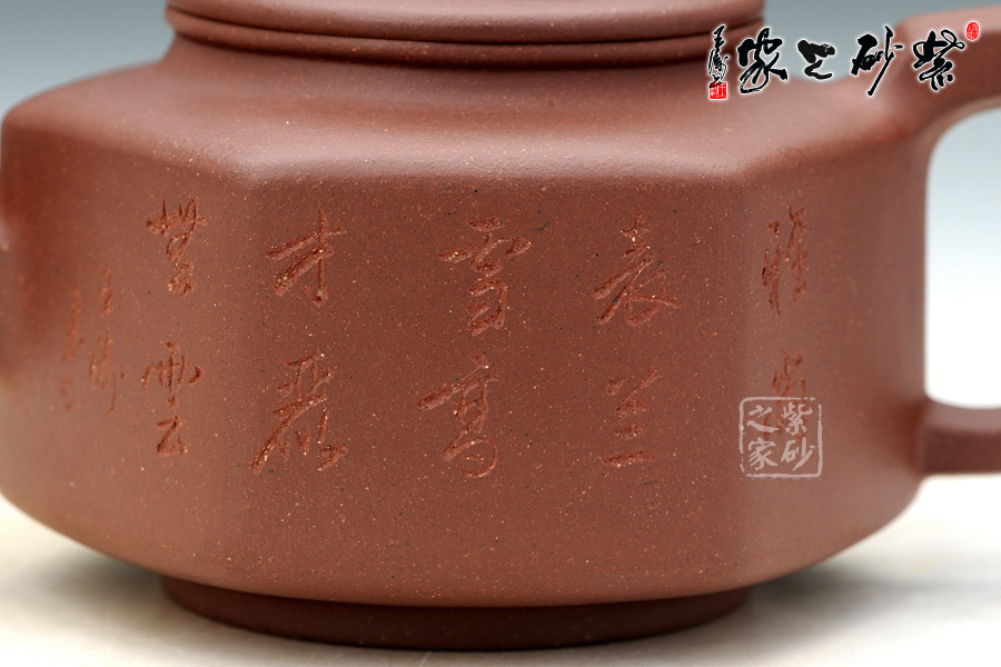 王濤老師已經(jīng)榮獲研究員級(jí)高級(jí)工藝美術(shù)師稱號(hào),將文人壺的氣韻發(fā)揚(yáng)下去,王濤老師的作品清秀而雅致,觀之清心無欲,實(shí)為絕好的茶器;此壺名為“圓順”,其實(shí)壺如其名,此壺的造型便是方圓結(jié)合,壺蓋壺鈕皆呈正圓形,象征的是圓滿大氣;壺身及把、嘴都成六方形,“六”有大順之意,象征著吉祥如意;雙層含義將此壺的寓意推至頂峰。王濤老師的壺一般裝飾為詩詞與山水,此壺亦是如此,簡(jiǎn)潔而清秀儒雅,此壺壺身正面篆刻的是“雅尚表蘭雪,高才麗無云”,出自一幅有名的以景寓情對(duì)聯(lián);壺身反面篆刻的是自然山水,刀筆細(xì)膩,山光水色之間,叫人極為享受。