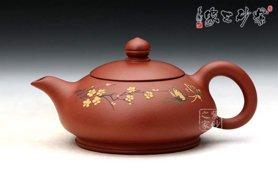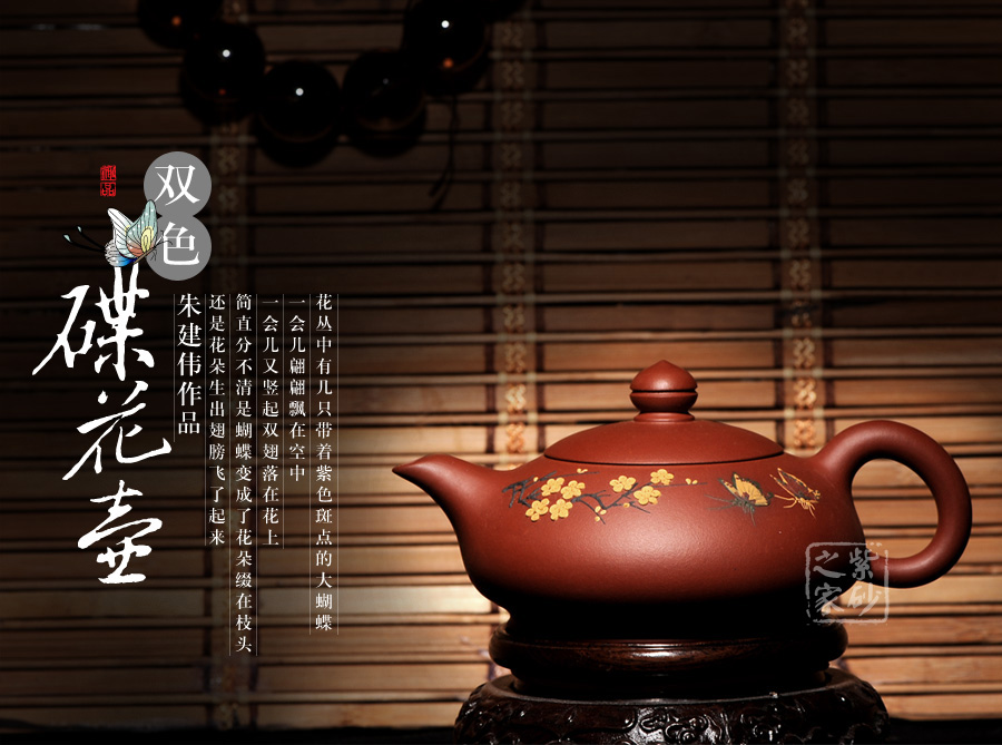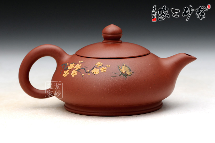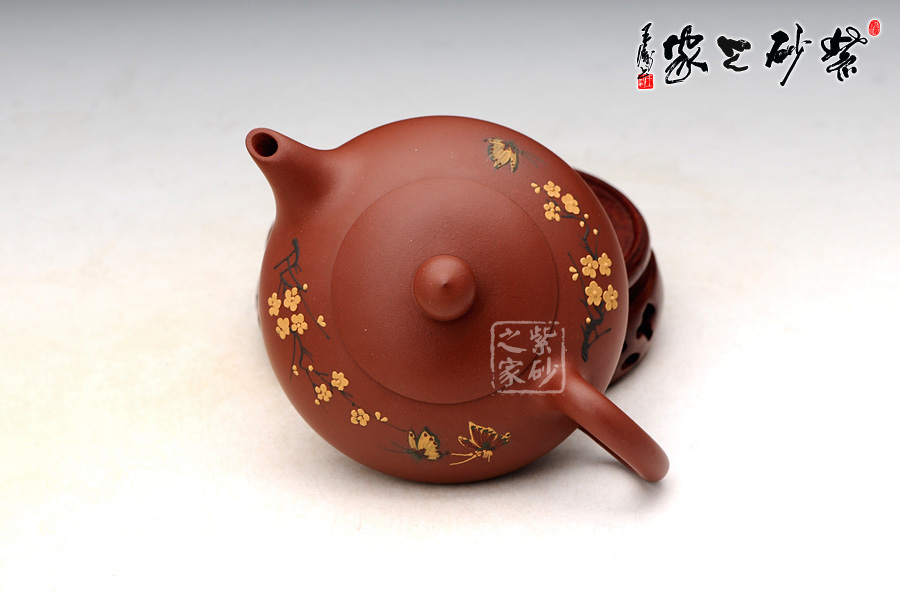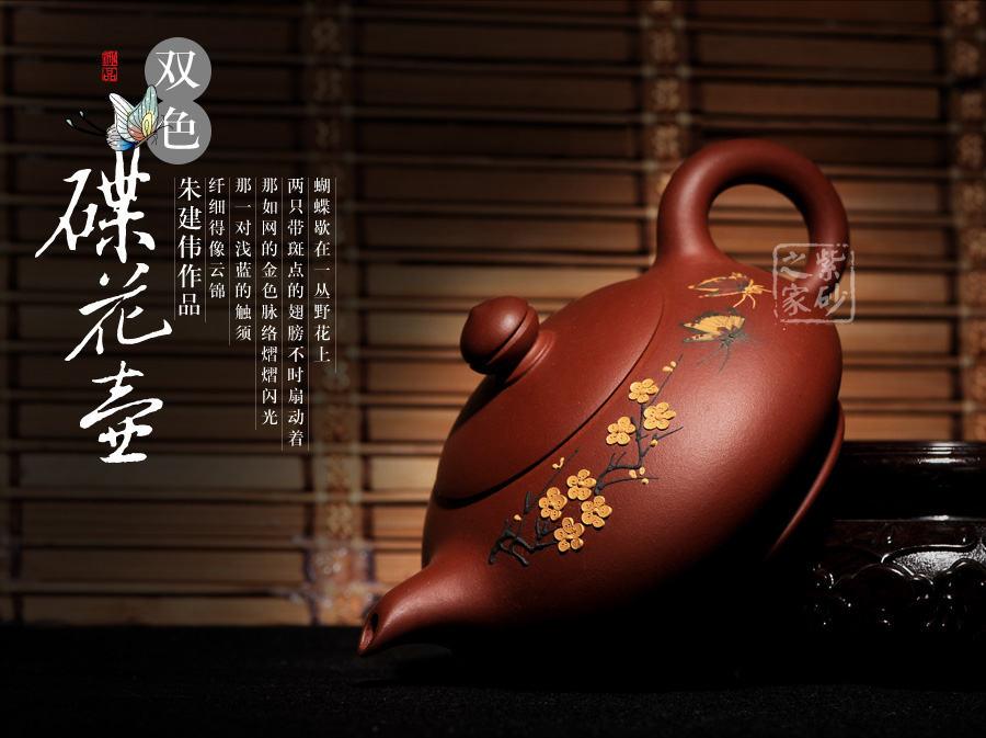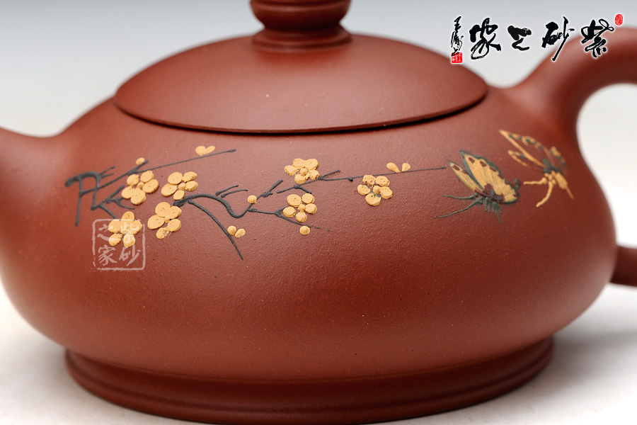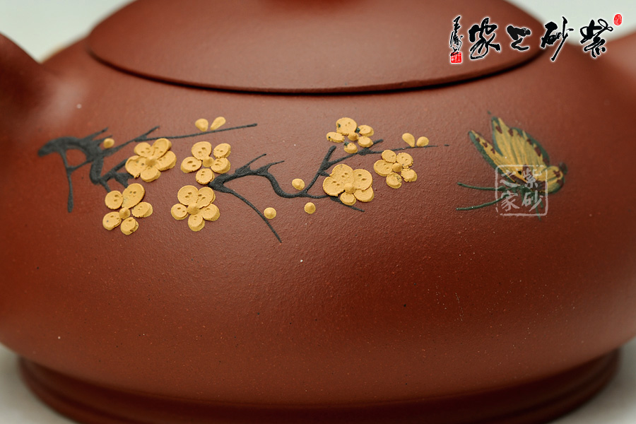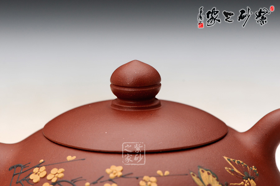 朱建偉老師的這把壺為獲獎(jiǎng)作品,曾獲得2006年中國手工藝精品博覽會(huì)“華茂杯”銀獎(jiǎng)。該作品造型線條流暢,構(gòu)思巧妙,壺身形狀如扁平的玉乳,飽滿儒雅,截蓋設(shè)計(jì)隨壺身的弧度而上,對(duì)壺身的完整度沒有絲毫的影響,一顆碩大的壺鈕如一顆壽桃,桃尖的胥出更顯鈕的圓潤;壺嘴平和尖銳,溫和向前伸去,暗接手法極精;壺把緊貼壺身,上提下拉,將力道融入壺型中;加底的設(shè)計(jì)增添壺身的霸氣和古拙之味,壺身結(jié)構(gòu)更為合理化;整個(gè)壺采用純?cè)V紫泥精工細(xì)作,壺身上采用多色泥料貼繪裝飾新工藝,難度大,手法新,一枝春梅下兩只蝴蝶翩翩起舞,生動(dòng)自然,呈祥和景象。