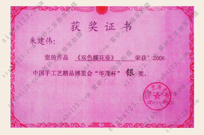 2006年《雙色蝶花壺》獲中國工藝精品博覽會(huì)“華茂杯”評(píng)比銀獎(jiǎng)