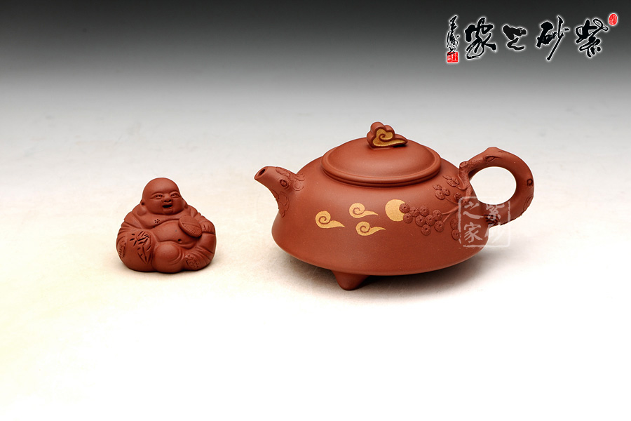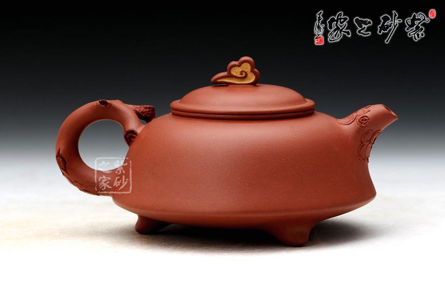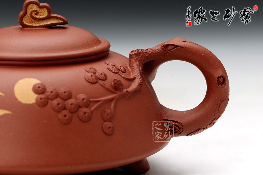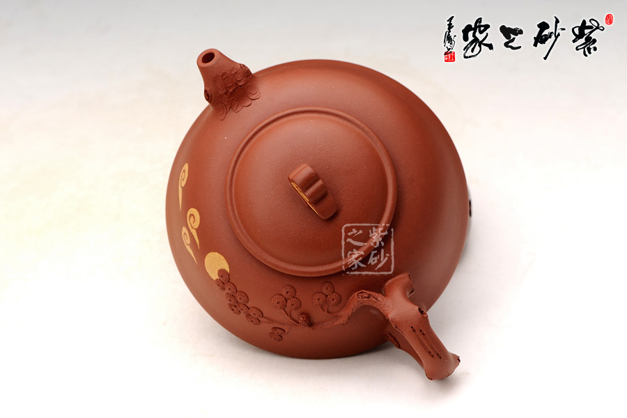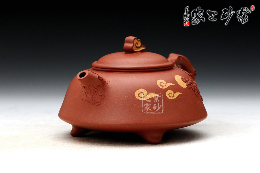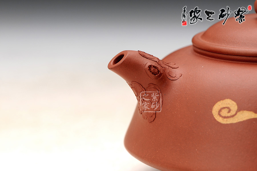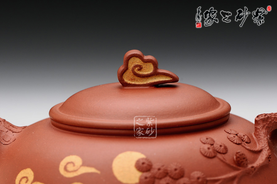 壺身上下十分流暢,壓蓋設(shè)計(jì) 子母線很薄,讓壺身壺蓋沒(méi)有斷層 壺鈕造型別致,呈一朵祥云之形,以金描之 更顯光輝熠熠,福運(yùn)頓生。