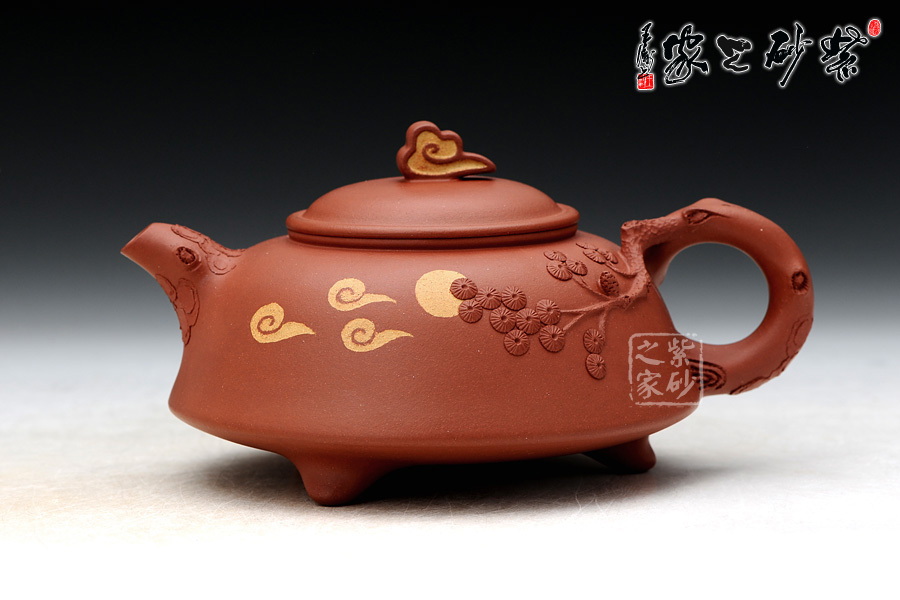 這款三足鼎式壺造型別致古雅,壺身造型就像是倒扣的碗形,且器身較扁,壺底三乳足,精巧別致,使得整個(gè)壺型展現(xiàn)出一股穩(wěn)重、渾厚的感覺(jué);壺身上下十分流暢,壓蓋設(shè)計(jì),子母線很薄,讓壺身壺蓋沒(méi)有斷層;壺鈕造型別致,呈一朵祥云之形,以金描之,更顯光輝熠熠,福運(yùn)頓生;壺嘴呈松樹(shù)枝干狀,貼花裝飾使之恰似松樹(shù)蒼老的皮膚,壺把同樣如此,蒼勁老道,細(xì)膩非常,一枝側(cè)枝從旁胥出,貼于壺身,壺身正面描金繪以皓月祥云景象,月亮一角被松枝所遮,突出遠(yuǎn)近立體之感。