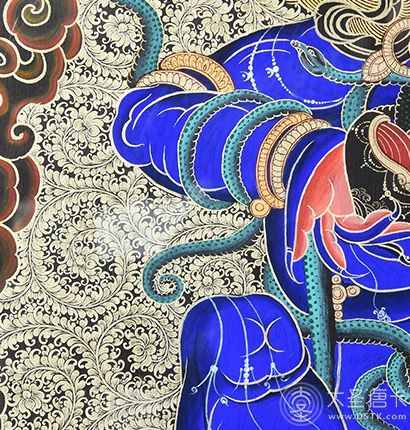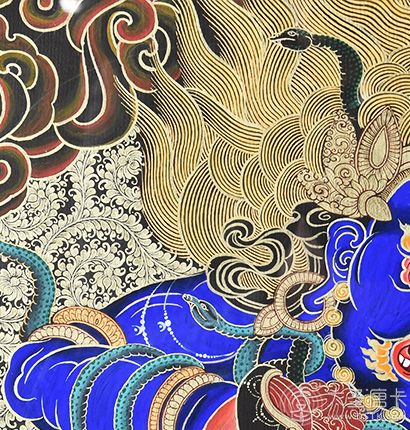 在繪制佛像服飾等位置時,用刻金技法,使圖案更具豐富的層次和立體感,用金勾勒的線條和圖案不但明亮度進一步提高,讓畫面更加燦爛,而且也使金在畫面上保持得更加長久。