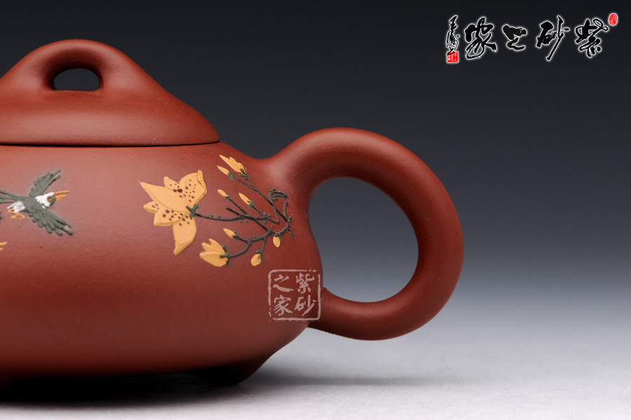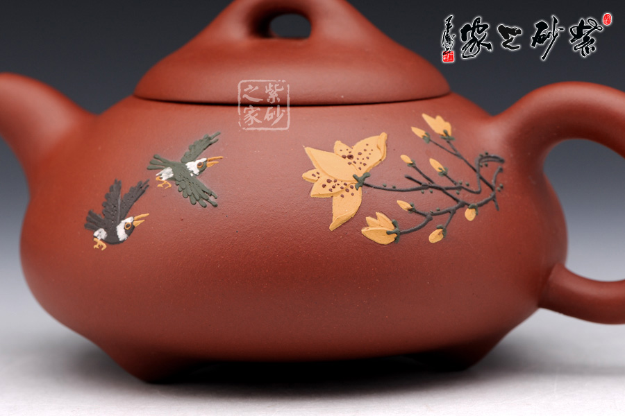 壺身正反面以泥繪的手法繪出“花鳥圖”,玉蘭裝飾,給素雅的壺身增添一份美感,春天的枝頭玉蘭花有的含苞待放,有的盛開美艷,兩只鳥兒被此美景吸引飛向枝頭停留,如詩(shī)的畫面怎能不令人回味無窮!