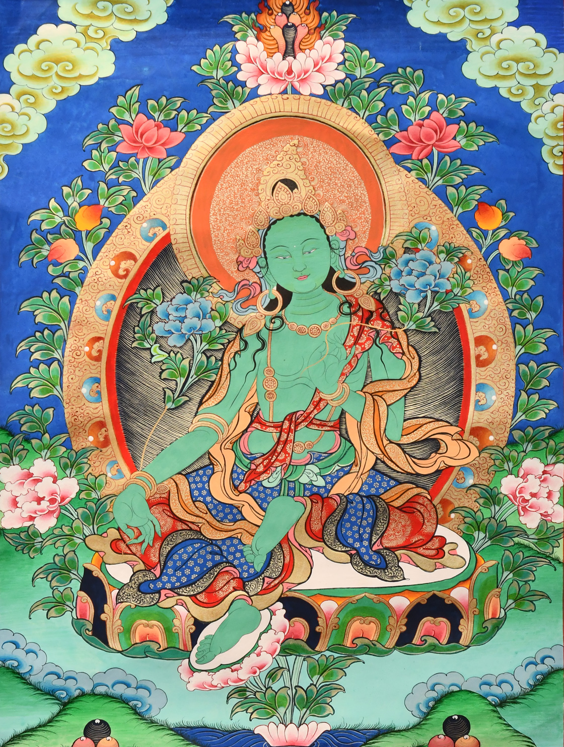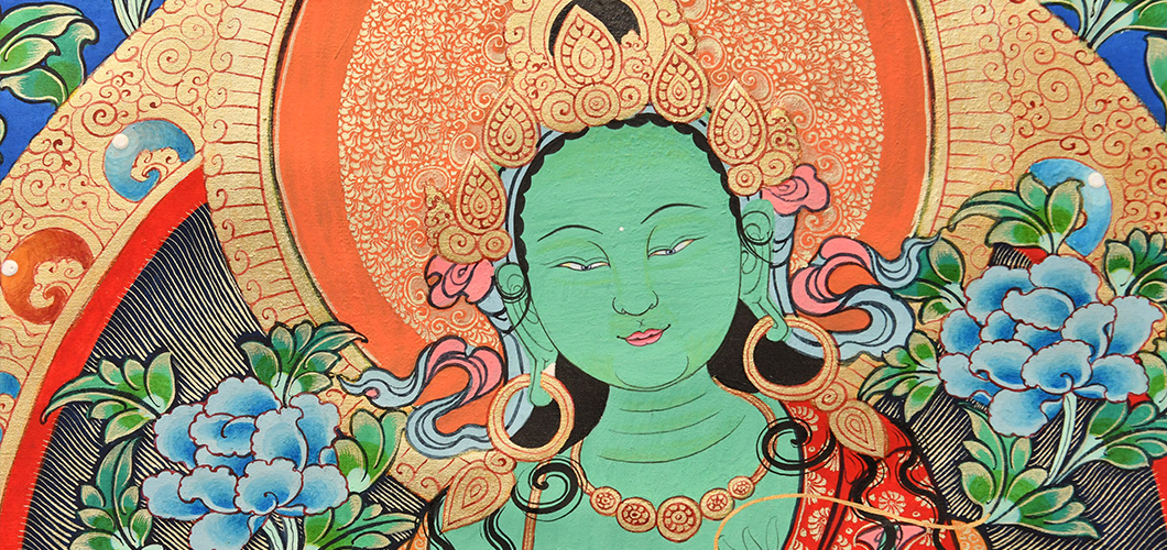 綠度母,藏語叫“卓姜”,是從觀音菩薩的眼淚中化現(xiàn)出來的,所以最慈悲。綠度母為所有度母之主尊,總攝其余二十尊化身之所有功德。因其救度之迅速、摧滅魔業(yè)之勇猛,故又稱作“救度速勇母”。