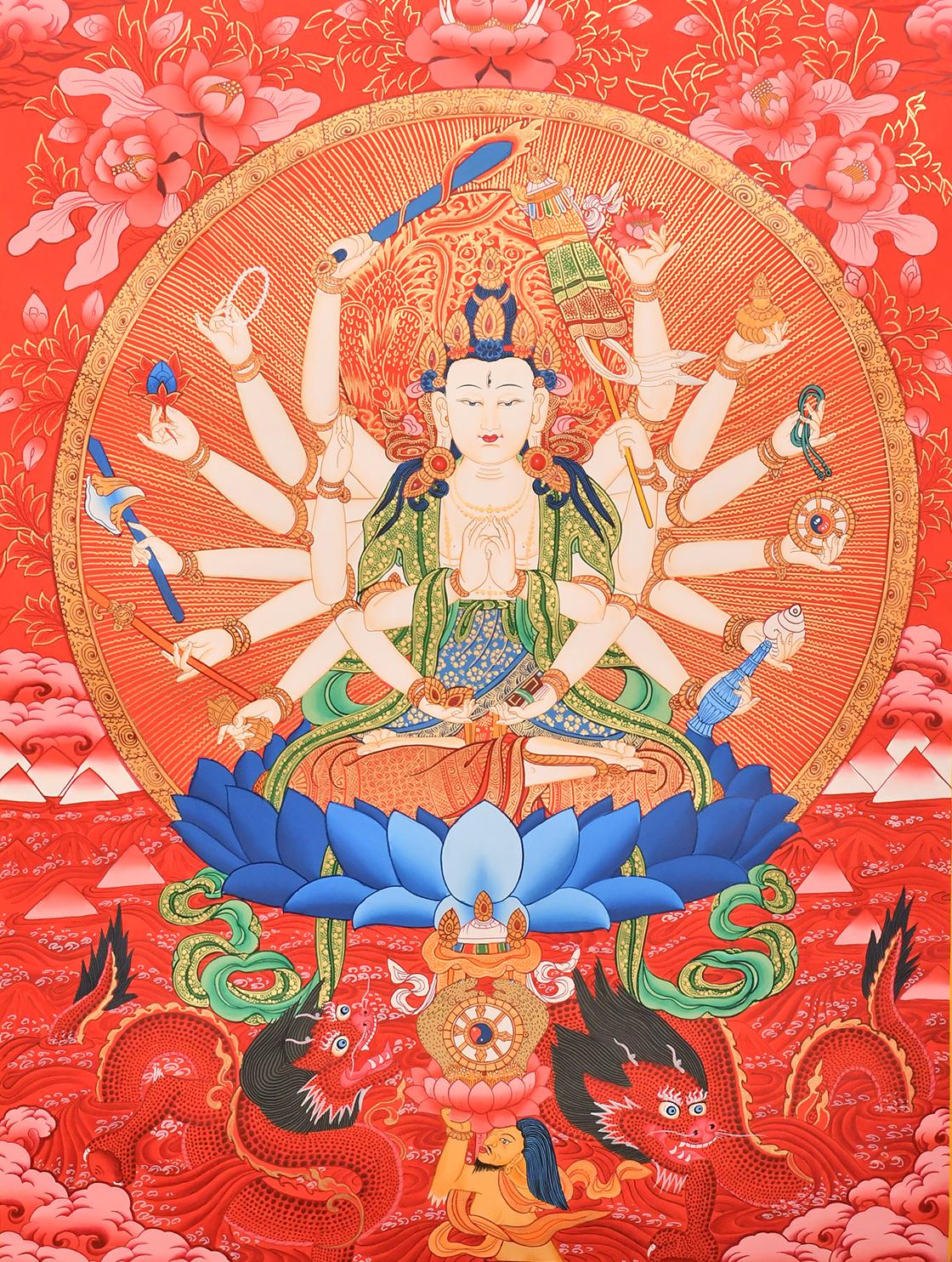 準(zhǔn)提佛母,Cundi系梵語(yǔ),漢譯有“準(zhǔn)胝”、“尊提”,準(zhǔn)提佛母又稱“準(zhǔn)胝觀音”、“準(zhǔn)提佛母”和“七俱胝佛母”等名。藏音“Bskul-bye-ma”。其以“準(zhǔn)提咒”見(jiàn)稱,曾為顯密佛教徒所知的大菩薩。在禪宗,則稱之為‘天人丈夫觀音’,以準(zhǔn)提為觀音部之一尊,深尊崇之,日本東密以準(zhǔn)提為六觀音之一、攝于蓮華部(千手觀音、圣觀音、馬頭觀音、十一面觀音、準(zhǔn)提觀音、如意輪觀音)中。獨(dú)臺(tái)密以七俱胝佛母準(zhǔn)提經(jīng)之經(jīng)名,準(zhǔn)提入于佛母中以為佛部之尊。“準(zhǔn)提”是清凈的意思,表示此菩薩心勝清凈,皎潔。