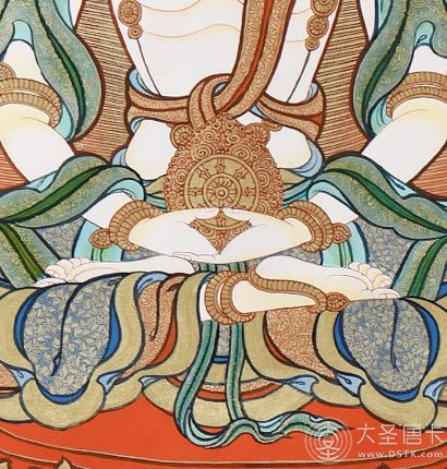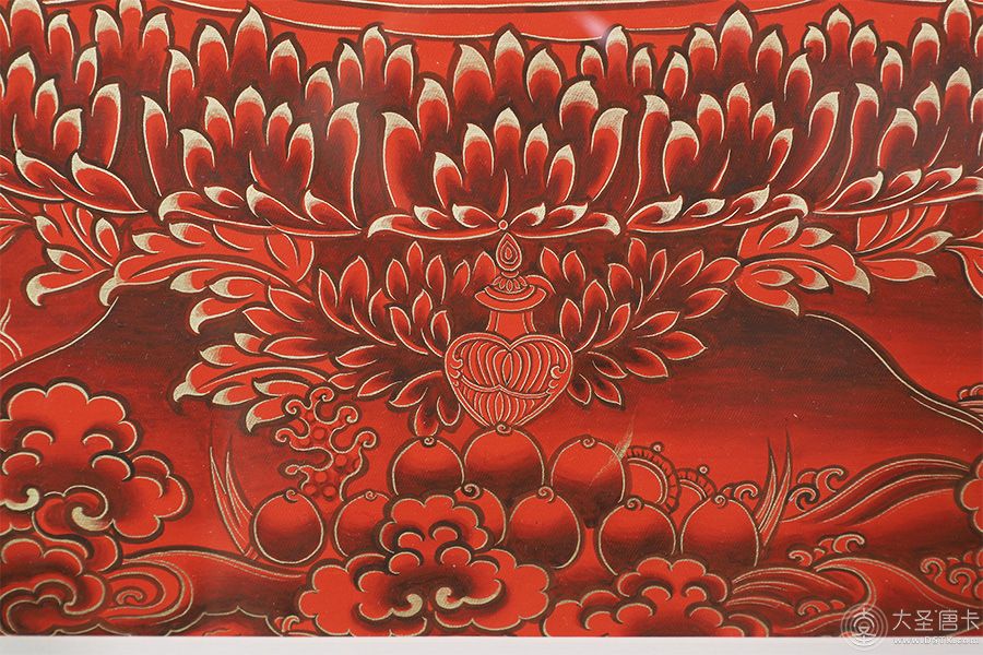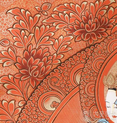 在繪制佛像服飾等位置時,用刻金技法,使圖案更具豐富的層次和立體感,用金勾勒的線條和圖案不但明亮度進(jìn)一步提高,讓畫面更加燦爛,而且也使金在畫面上保持得更加長久。