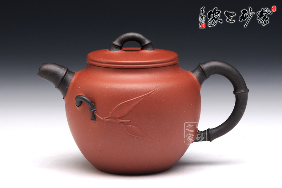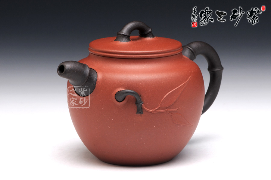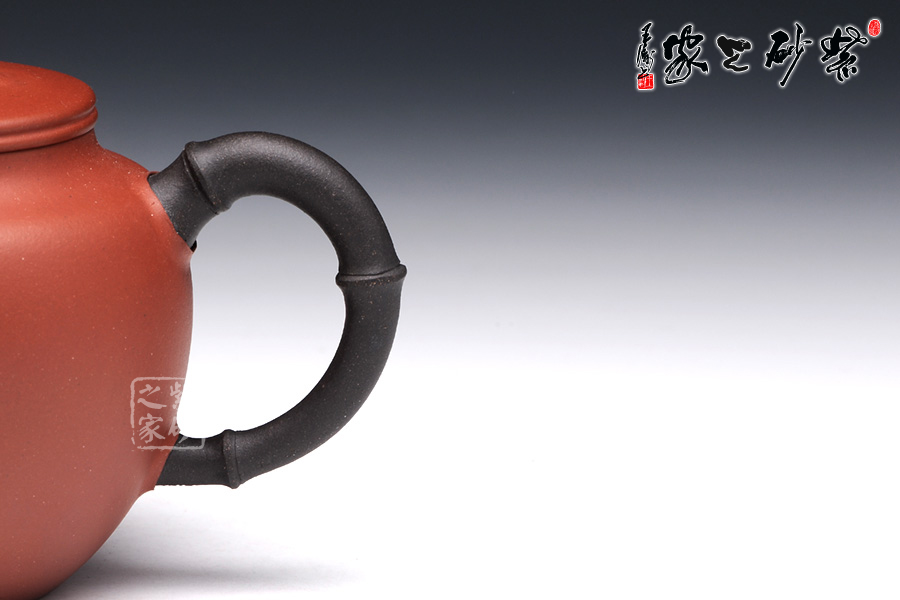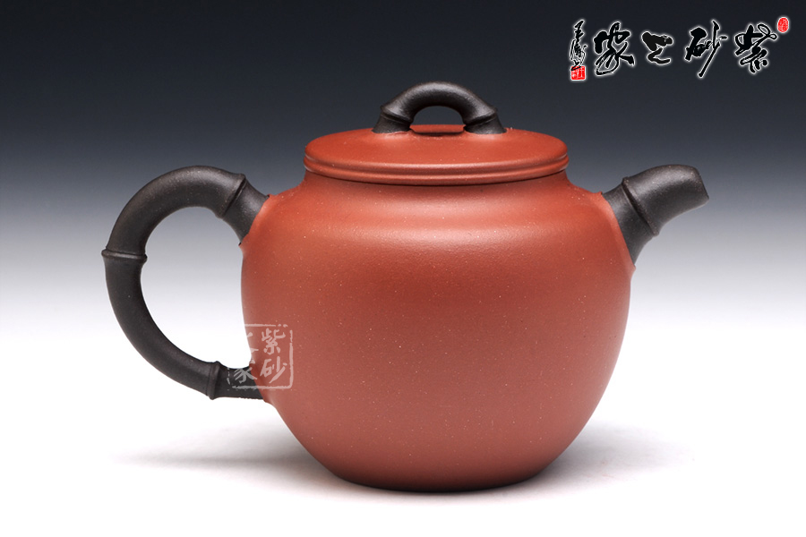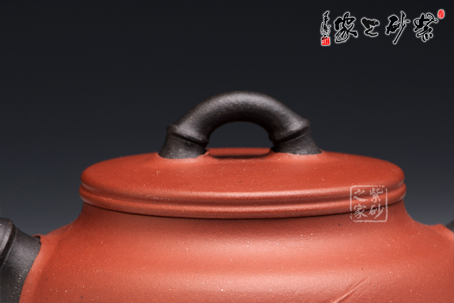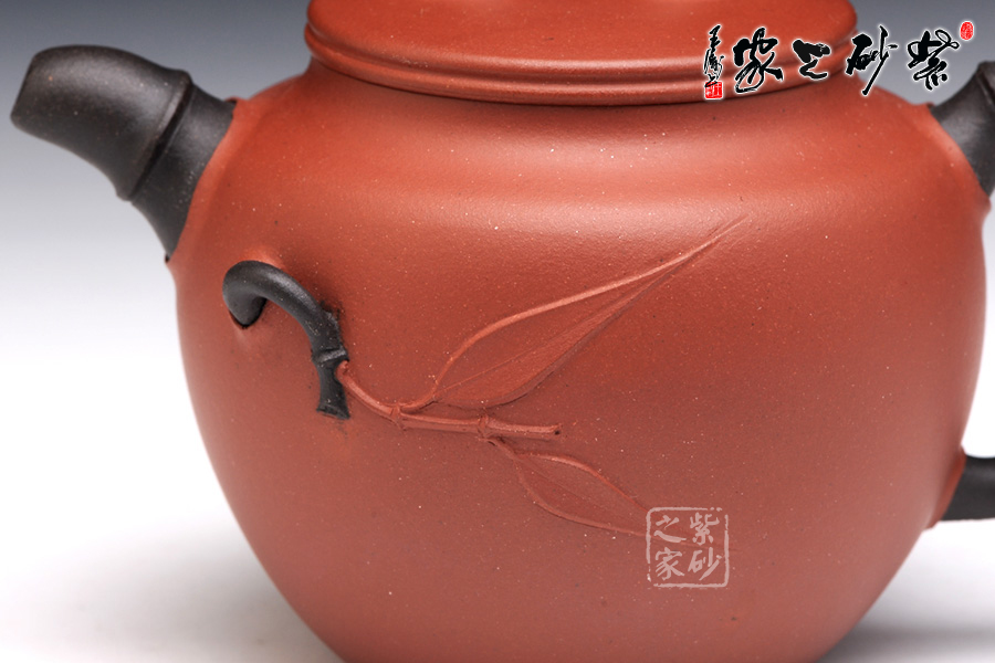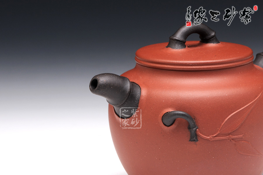 雙色高竹,用雙色做竹,越是玩味就越是喜歡。壺身似圓形容器,圓而不笨,高而不瘦,光澤內斂沉厚,玩味之意十足。壺把、壺鈕和壺嘴都是竹形,與眾不同的是皆用了黑色泥料,看起來就像是過火的竹節(jié),非常有趣。此外,壺身上還多了一小節(jié)竹葉,葉尖鋒利,節(jié)點分明,讓人愛不釋手。
