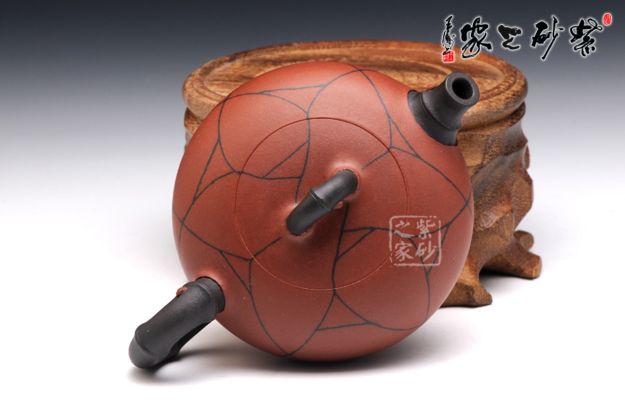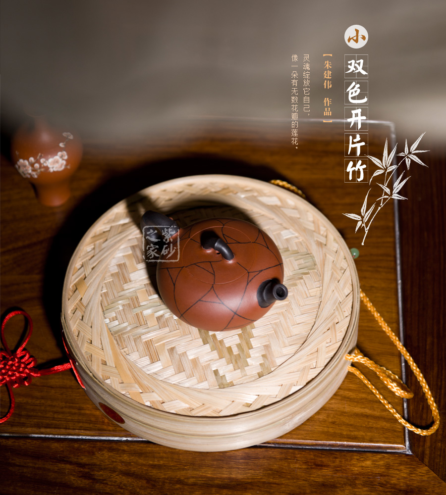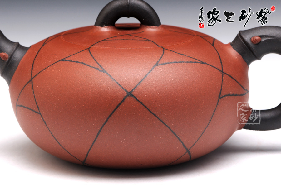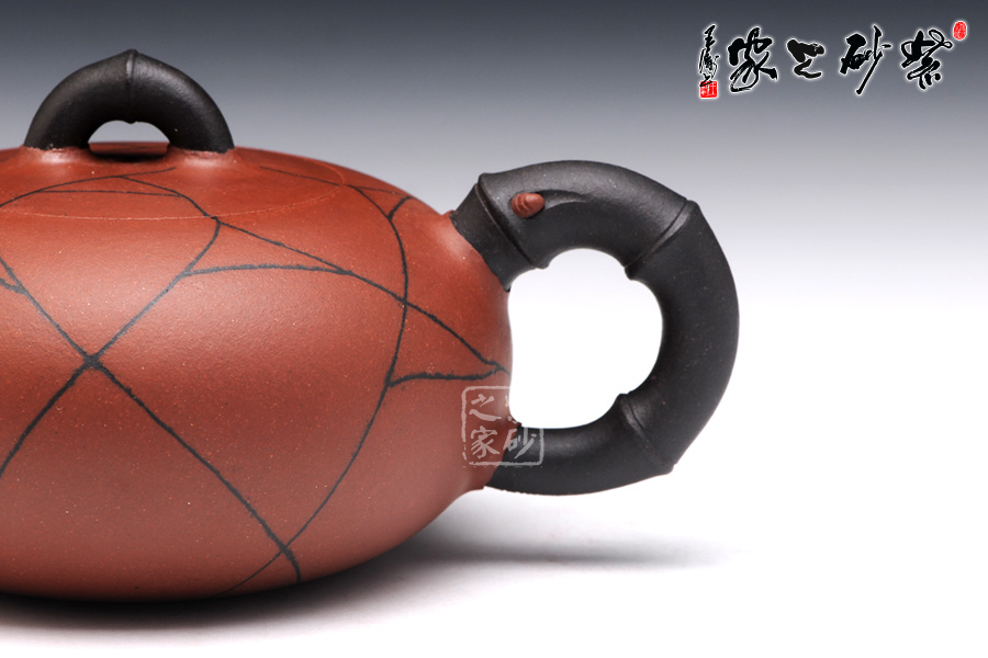 此壺制作手法多樣,非常難得。雙色泥制壺,為朱建偉老師拿手好戲。且看壺身和壺嘴、壺鈕及壺把,泥料顏色不同,造型更截然相反,還是明接處理,但卻巧妙地融為一體,互相凸顯,既展示了花貨的生動自然,又表現(xiàn)了圓器的工藝味道,的確很不一般。再說這開片制作,壺身的紋理走向甚是特別,越是欣賞,就越有味道。仿佛是一層花紋,但卻又不是刻意為之,真叫人無限喜歡。