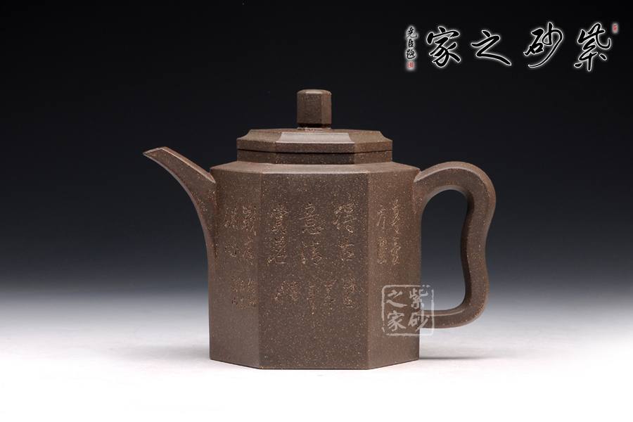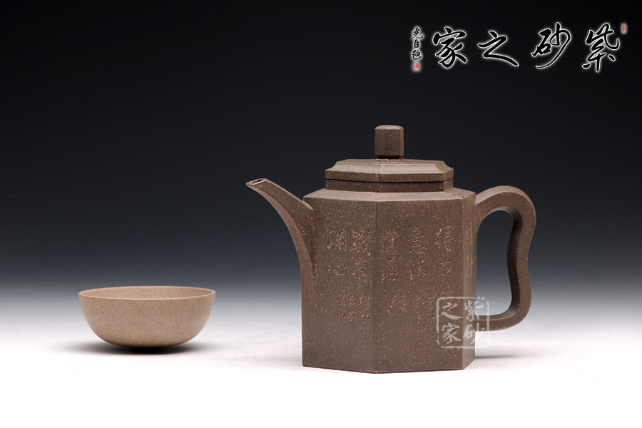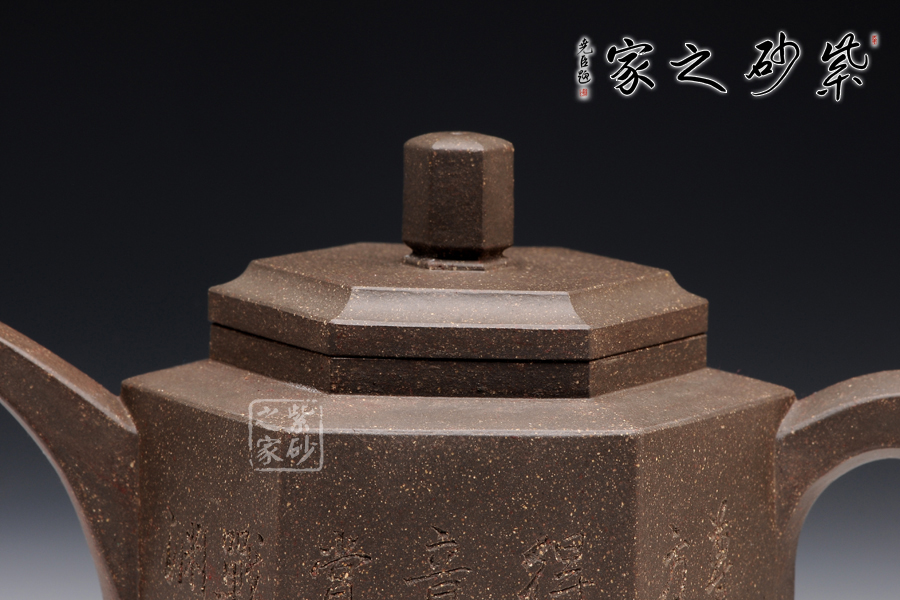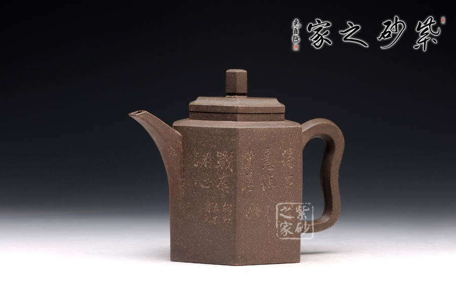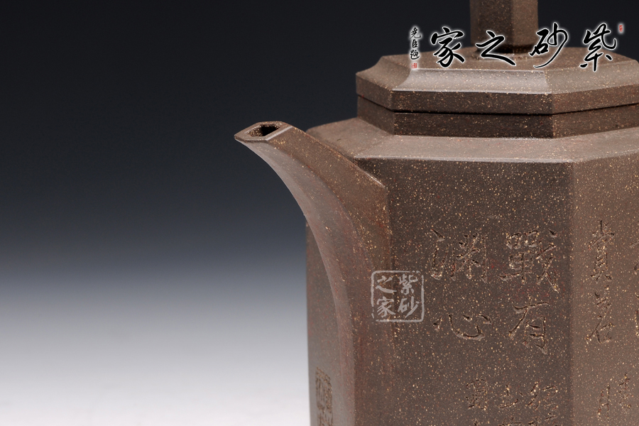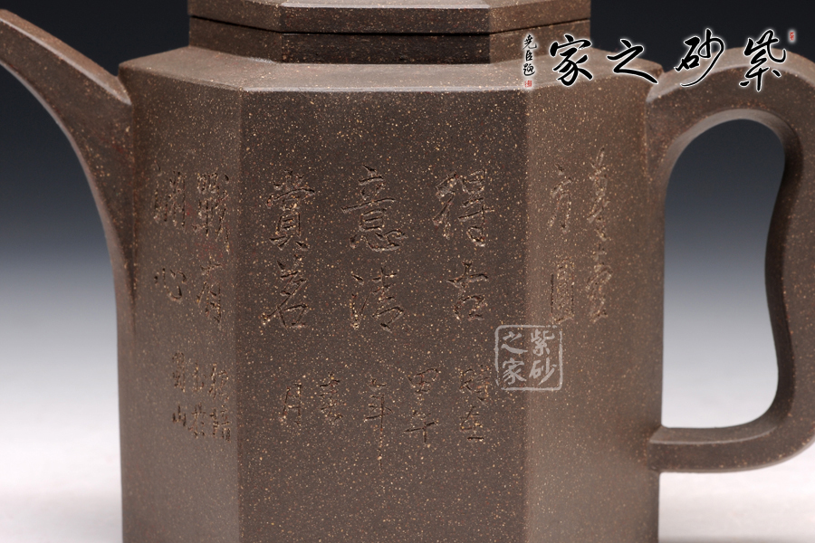 此玲古六方壺,精選原礦青灰泥精制而成,呈深紫灰色調(diào),因滿布顆粒,觸感特殊。該壺的壺身,壺蓋,壺鈕,壺把皆呈六方形,且線條清晰有力,對稱工整,做工精細(xì)。壺鈕若壓縮版的壺身,精致小巧。一彎流壺嘴上揚(yáng)彎曲,漸彎漸細(xì),造型新穎,出水爽利。紫砂壺把,猶若彌勒佛的大耳,仿若可以聽六路,掌萬物。整壺寓意高遠(yuǎn),令人神清氣爽。此壺刻繪由顧紹培題,更顯誠意,實(shí)為賞玩的佳品。