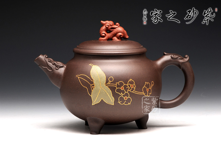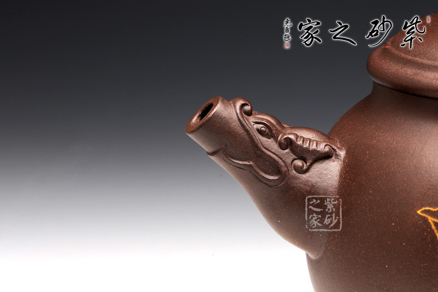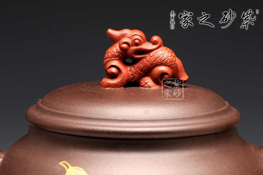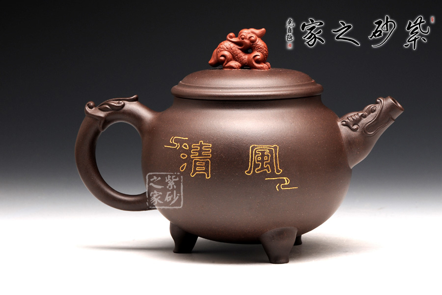 此壺造型獨(dú)特,構(gòu)思巧妙,從此壺的外表來看,便可見老師高超的技藝和細(xì)膩的手法。紫砂泥制作而成的此壺,清逸亮澤,細(xì)膩綿柔,可見老師善于用料,心質(zhì)細(xì)膩。該壺上下收斂,而壺腹如鼓圓潤,以龍頭作壺嘴鳳尾作壺把,呼應(yīng)主題又具趣味性,且兩者制作形象又逼真。壺底三個(gè)小巧的乳足,精致美觀,妙趣橫生。壺鈕更是一抹亮彩,截然與壺身泥色不同,龍獅造型,內(nèi)斂吉祥。可謂龍盤鳳舞,精彩紛呈!