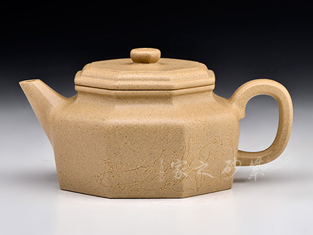 八方壺鈕方中見圓, 溜肩造型極其優(yōu)美,雙重肩線如同宮燈上下鑲接線,增添了壺的藝術(shù)感;壺把緊挨肩線向上挑出,曲線流至飛處,向下而去,最終收于壺身下方;壺嘴自壺身中上方蜿蜒伸出,嘴口朝上,嘴頭略微向外伸出,形成彎流,極其優(yōu)美。