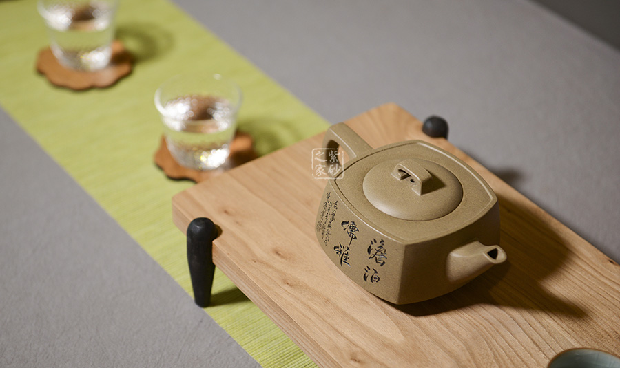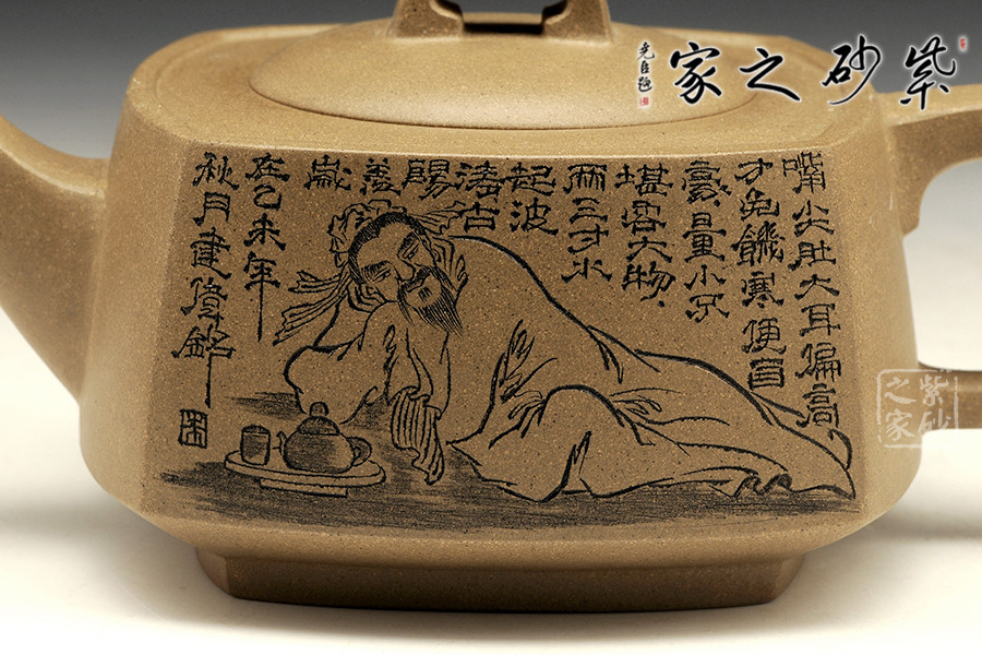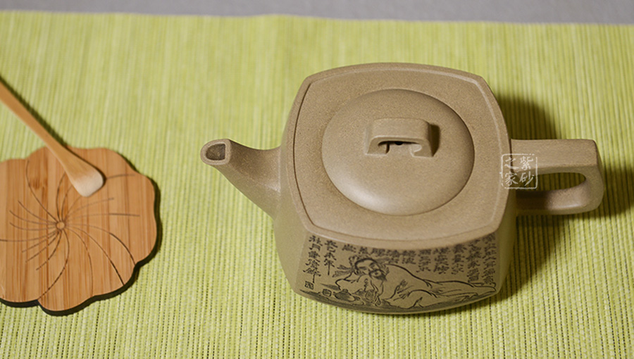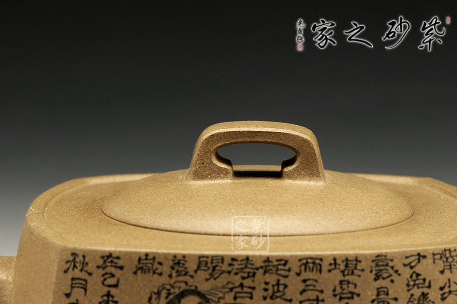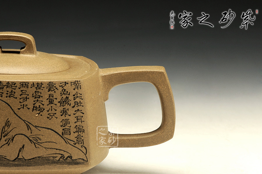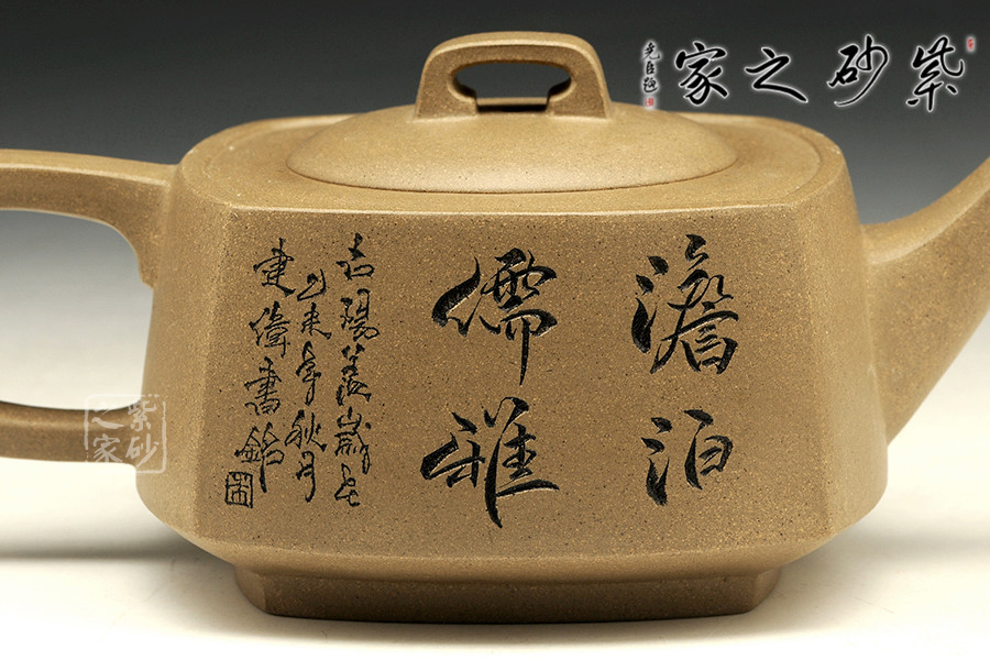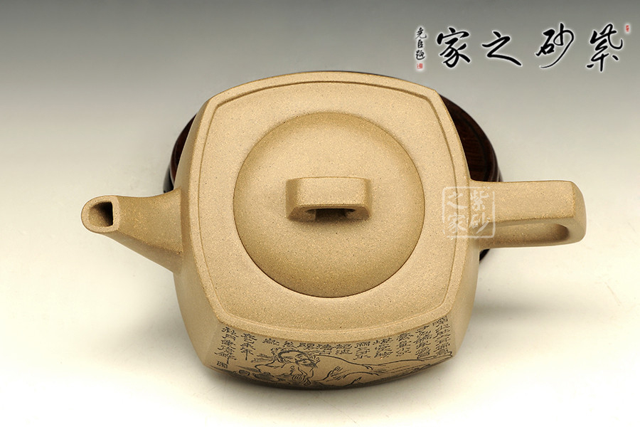 此壺方圓有致,將方形的挺括與圓潤的柔和相互捏合,塑造一種古樸的質感,內斂低調。整器流嘴方把,口蓋圓渾,嵌蓋微鼓。制形沉穩(wěn),顯出壺體的莊重厚實之感。壺體似圓若方,方中現(xiàn)圓,圓中見方。方圓結合,巧奪天工。品味此壺,以簡寫繁,小中見大的感受非常突出,所謂寓巧于拙,便是如此。