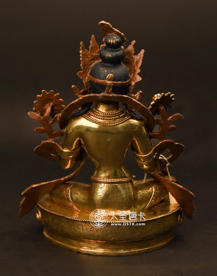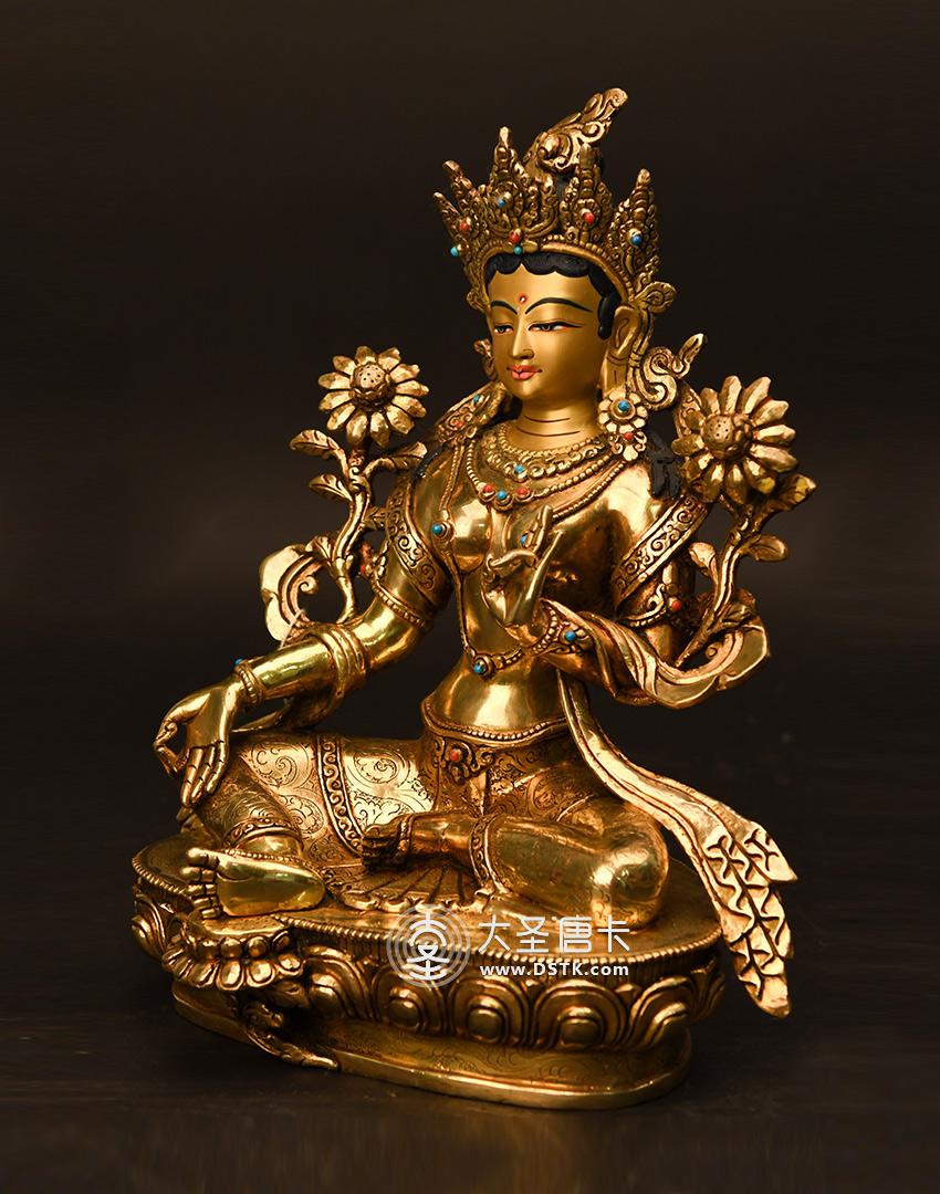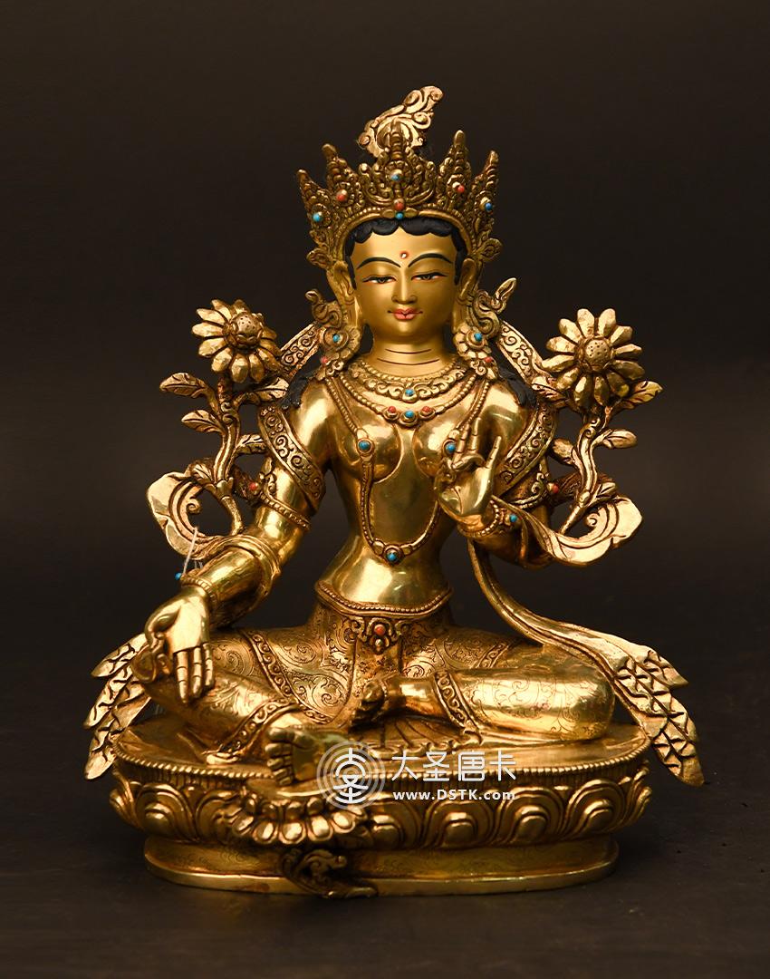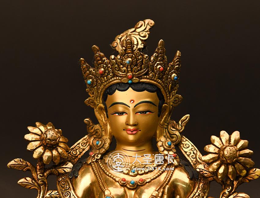 【綠度母的法相】綠度母造像為菩薩裝,全身呈翠綠色,是藏傳佛教的事業(yè)部之色,亦即不空成就佛之身色。一面二臂,面容姣好,二八妙齡,身材纖細(xì),美貌絕倫。頭戴小五佛寶冠,身子放射出虹光,身佩各種瓔珞珠寶,著各色天衣,下身重裙,其形象華貴美麗,慈祥莊嚴(yán)。