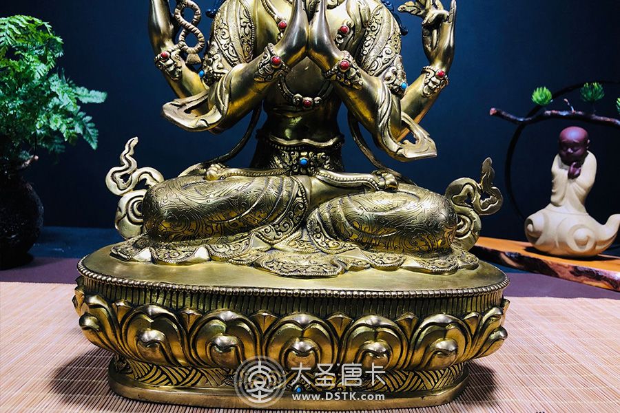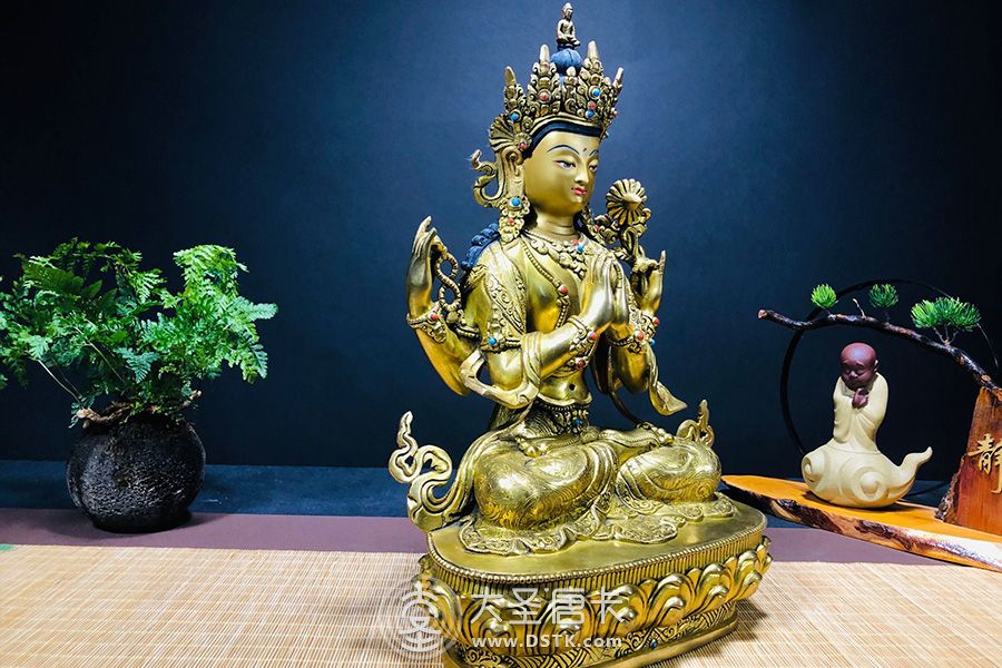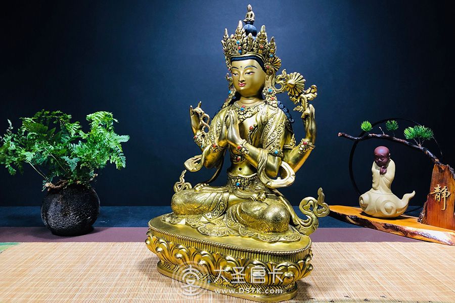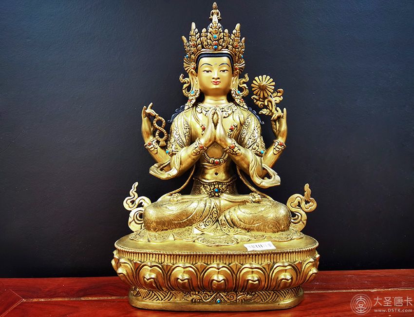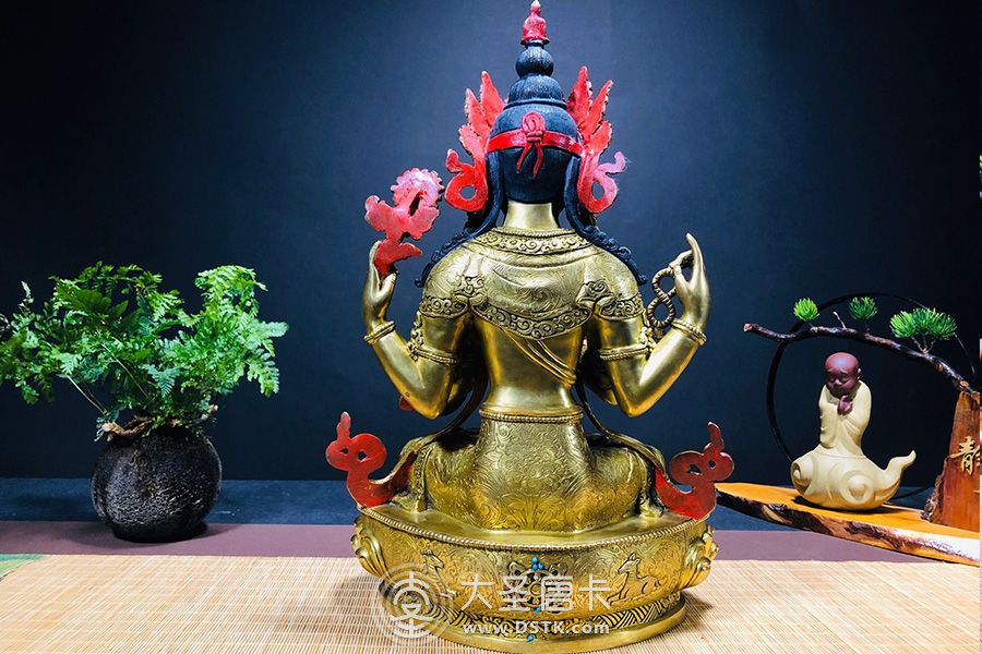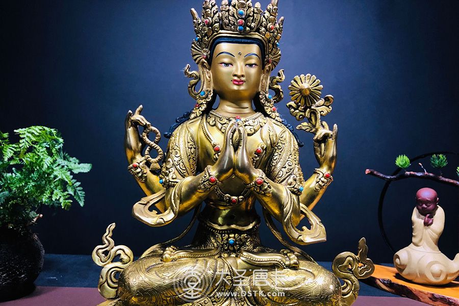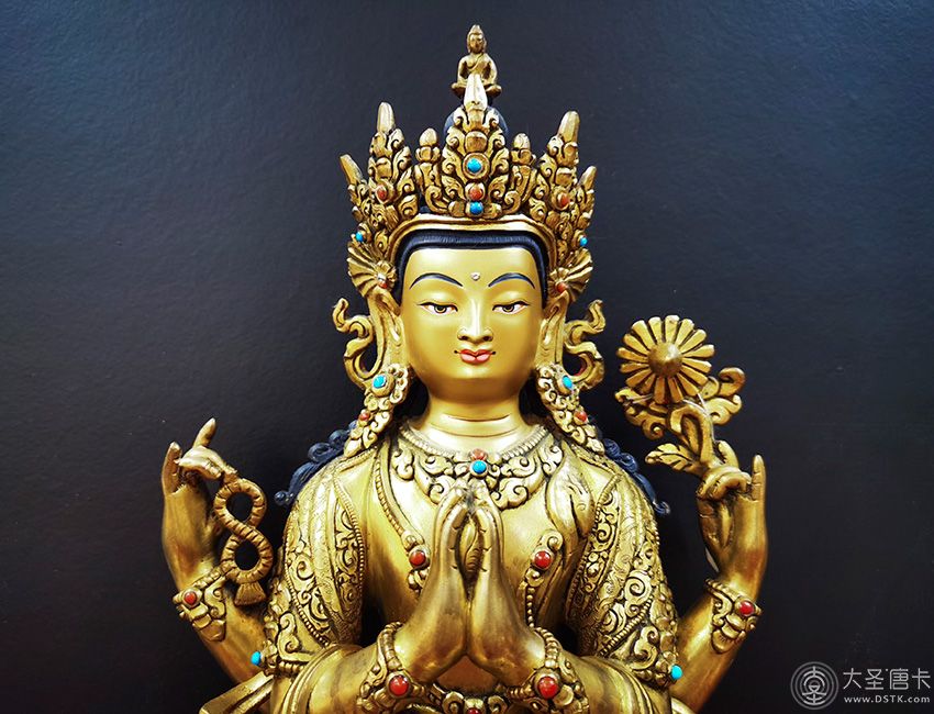 四臂觀音,雪域西藏的守護(hù)神,為西藏佛教密宗本尊之一。本尊身顏潔白如月,頭戴五佛冠,發(fā)黑色結(jié)髻,中央二手合掌於胸前,捧有摩尼寶珠,右手持水晶念珠。左手拈八瓣蓮花與耳際齊,面貌寂靜含笑。