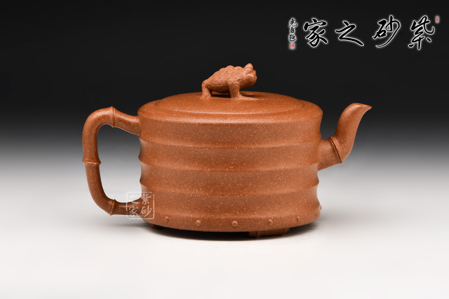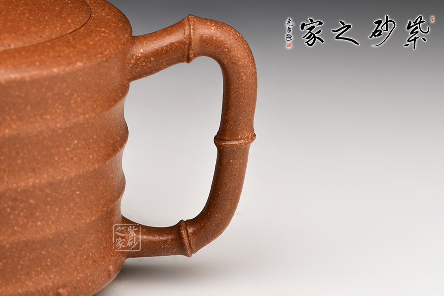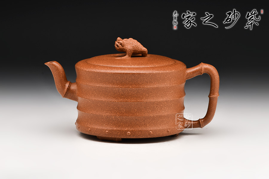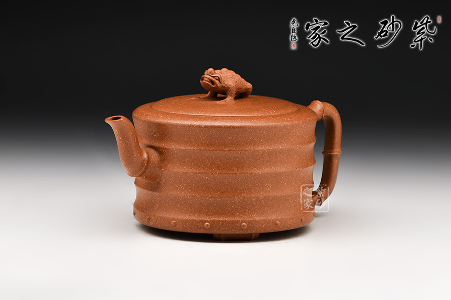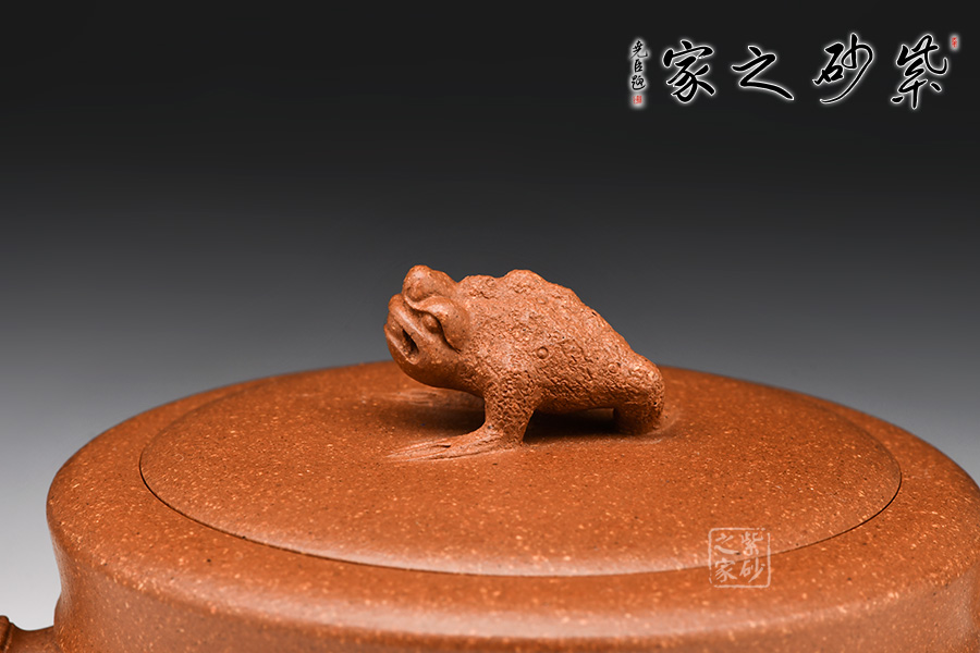 流把呈現(xiàn)竹節(jié)形狀,自然和諧,生機(jī)勃勃。還有蟾蜍形的壺鈕,口含錢幣,碩大的嘴,暴突的大眼,以及喜氣洋洋的神氣,平添了一縷情趣,亦寓意財(cái)源興盛,生活幸福美好。