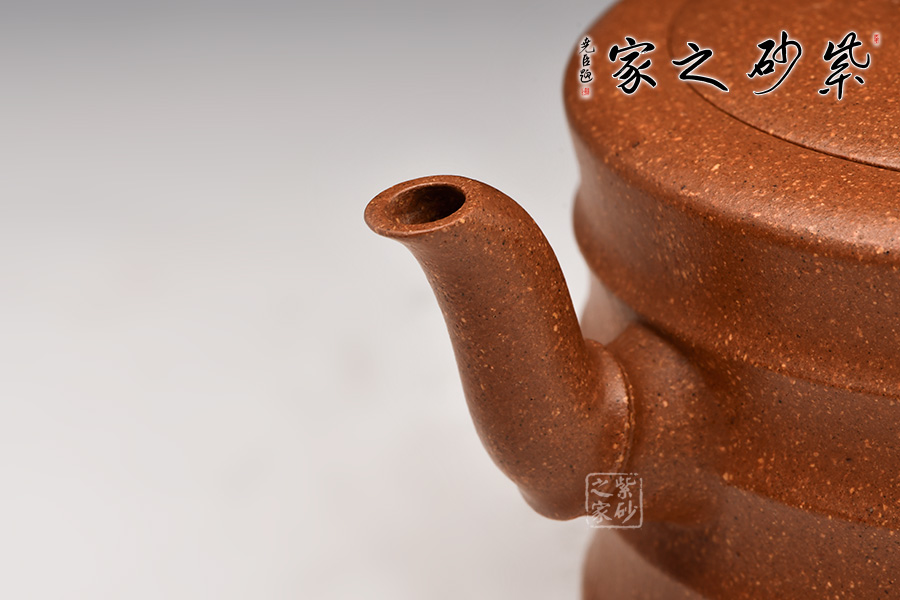 此壺造型十分有靈氣,壺身略高,飽滿而圓潤,線條流暢。壺身四圈環(huán)腰,呈現(xiàn)一梯一梯的階梯狀,各段之間過度自然,精工修整,層層而上,正有節(jié)節(jié)高升之意。
