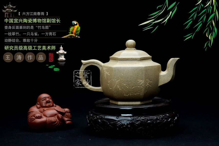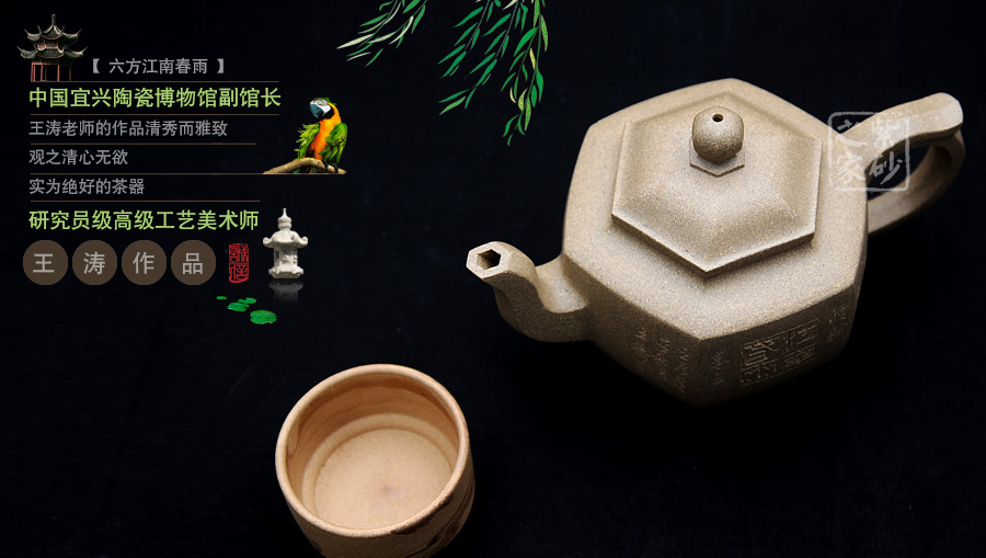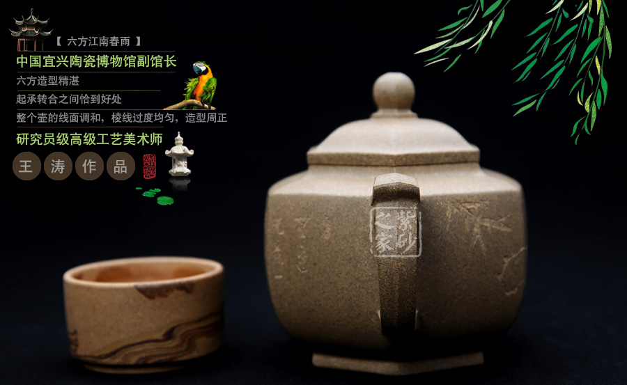 ↑ 壺身正面篆刻的是“江南春雨”四個(gè)字,四字錯(cuò)落有致,字體優(yōu)雅細(xì)膩,令人賞心悅目,六方造型精湛,起承轉(zhuǎn)合之間恰到好處