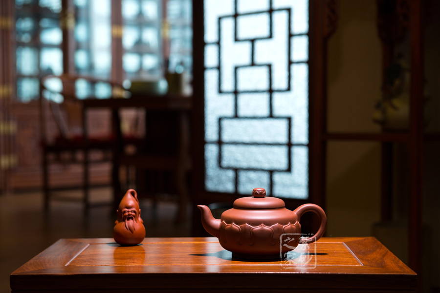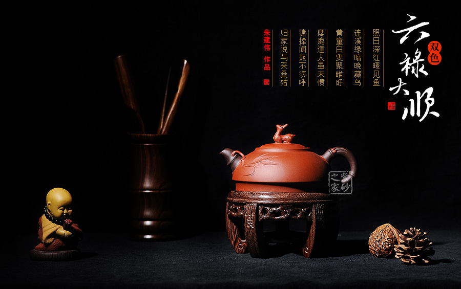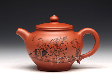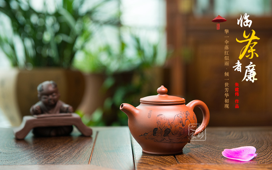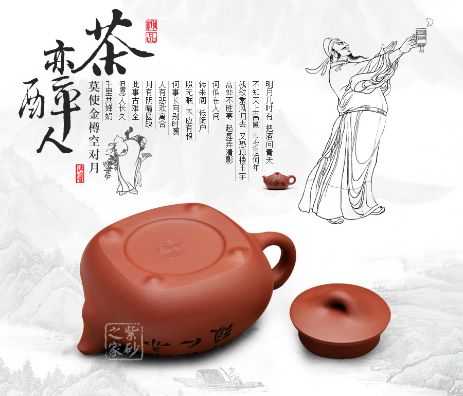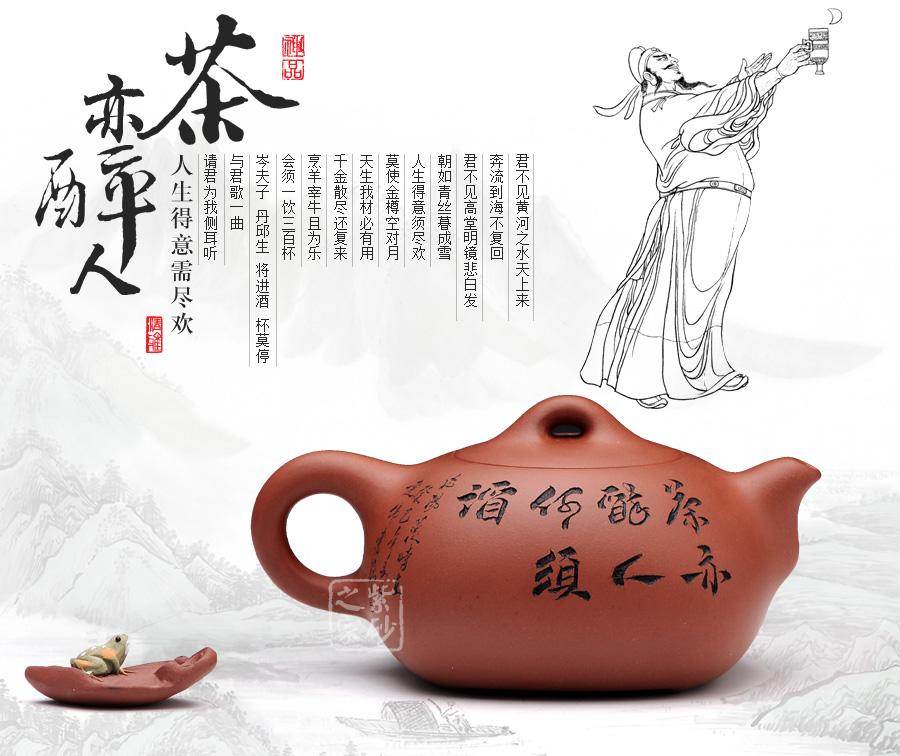 ↑ 壺身陶刻由朱建偉老師親自操刀,壺身正面所篆刻的是“太白醉酒圖”,圖中詩人李白抱著酒壇昏昏欲睡,配的是杜甫名詩《飲中八仙歌》的詩句:“李白一斗詩百篇,長安市上酒家眠,天子呼來不上船,自稱臣是酒中仙”,詩詞以優(yōu)雅的隸書所刻,清秀飄逸,俊朗有神;壺身反面篆刻的是“茶亦醉人何須酒”,此為清朝醉月山人所著名詩。
