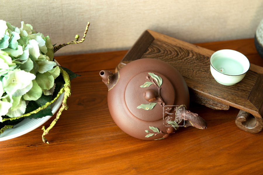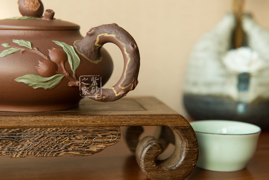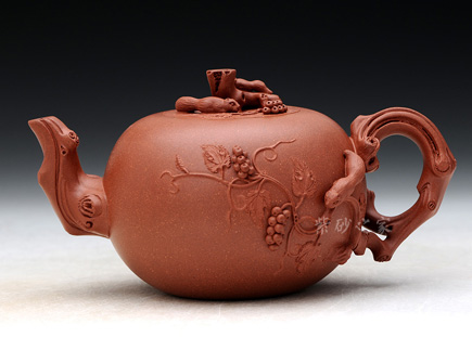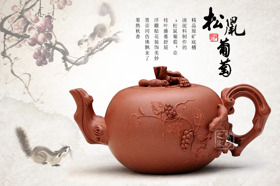 精品原礦底槽 清泥料制作的 “松鼠葡萄”壺, 枝葉藤蔓舒展 ,浮雕貼花裝飾美妙, 賞壺間仿佛飄來(lái)了 果熟秋香。