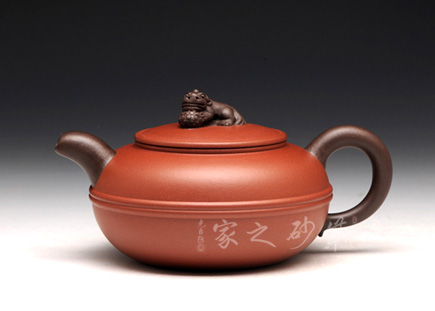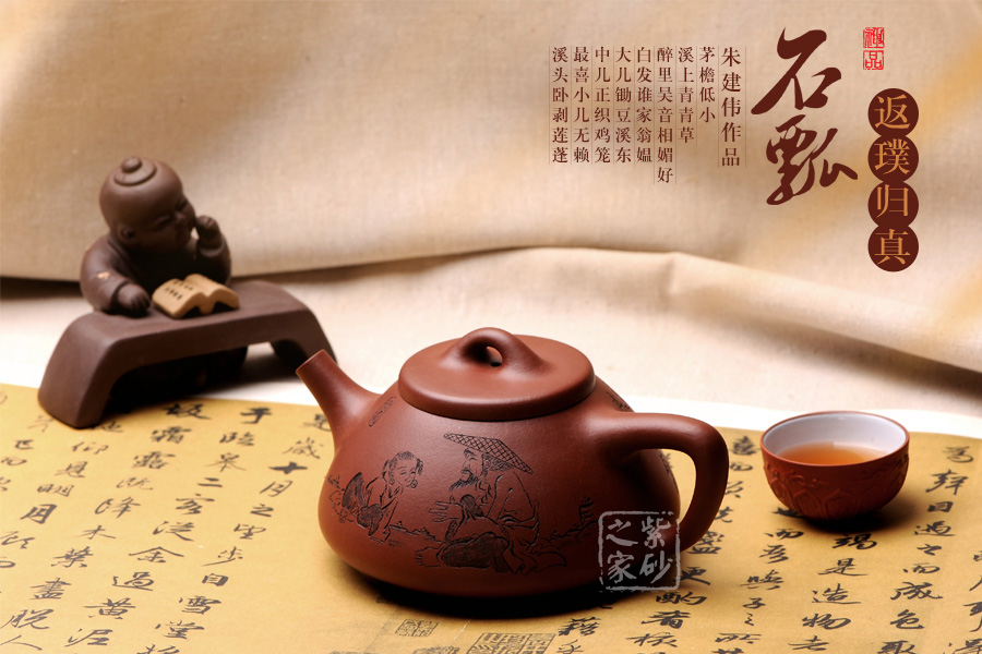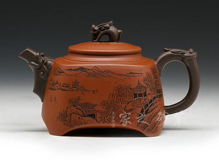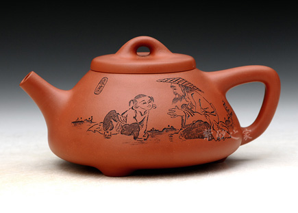 壺身陶刻由朱建偉老師親自操刀,壺身正面所篆刻的是“太白醉酒圖”,圖中詩人李白抱著酒壇昏昏欲睡,配的是杜甫名詩《飲中八仙歌》的詩句:“李白一斗詩百篇,長安市上酒家眠,天子呼來不上船,自稱臣是酒中仙”,詩詞以優(yōu)雅的隸書所刻,清秀飄逸,俊朗有神;壺身反面篆刻的是“茶亦醉人何須酒”,此為清朝醉月山人所著名詩。