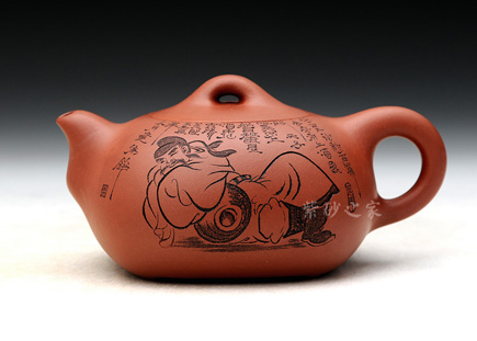 壺身陶刻由朱建偉老師親自操刀,壺身正面所篆刻的是“太白醉酒圖”,圖中詩(shī)人李白抱著酒壇昏昏欲睡,配的是杜甫名詩(shī)《飲中八仙歌》的詩(shī)句:“李白一斗詩(shī)百篇,長(zhǎng)安市上酒家眠,天子呼來(lái)不上船,自稱臣是酒中仙”,詩(shī)詞以優(yōu)雅的隸書(shū)所刻,清秀飄逸,俊朗有神;壺身反面篆刻的是“茶亦醉人何須酒”,此為清朝醉月山人所著名詩(shī)。