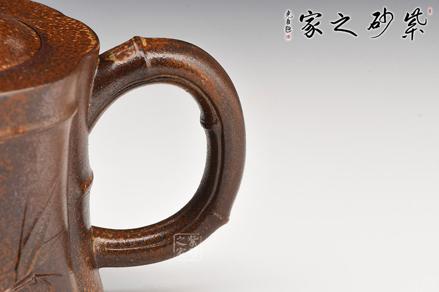 此壺器型也以竹為元素,原礦紫泥為料,壺面砂質(zhì)隱玉,手感細(xì)膩潤(rùn)滑,氣韻高潔。壺身呈柱形,身、嘴、把與鈕皆以竹節(jié)為形,將竹的氣節(jié)與高雅完美展現(xiàn),壺身靠近壺把部位有幾枝竹葉點(diǎn)綴其上,竹葉修長(zhǎng),葉脈分明。