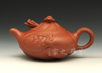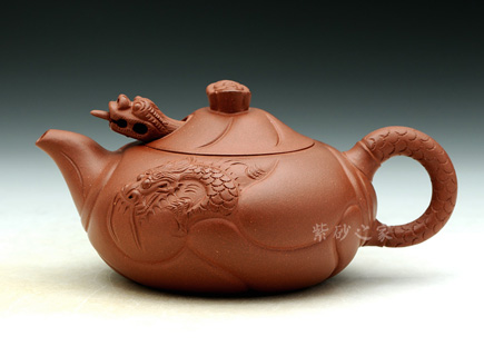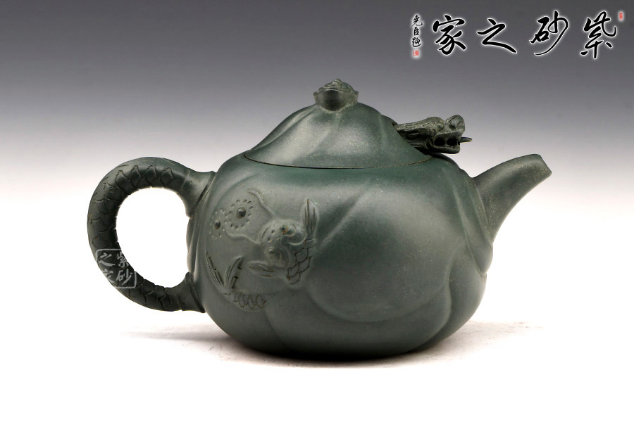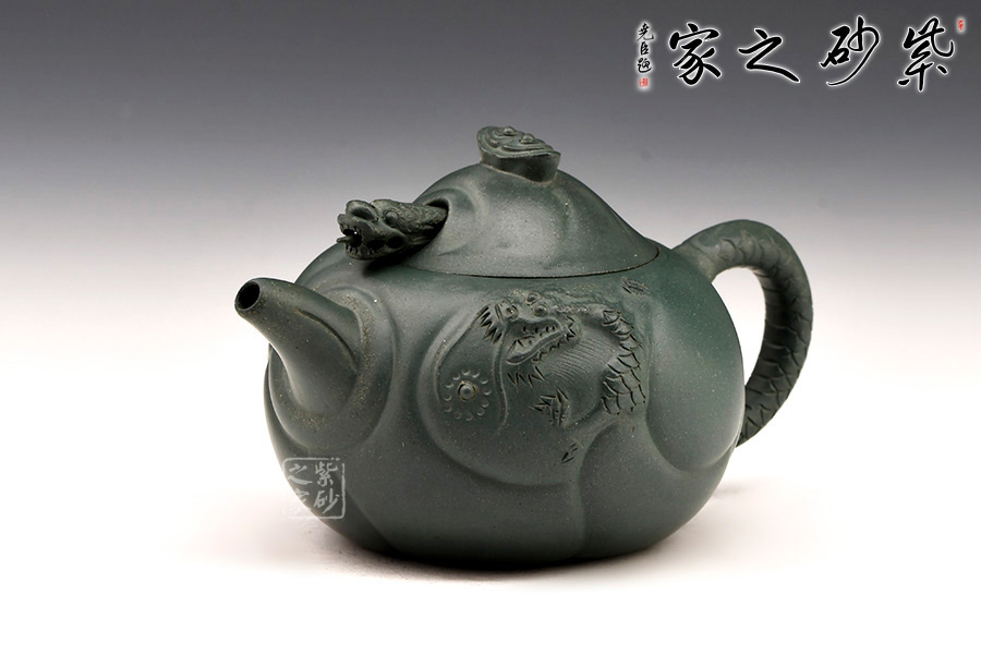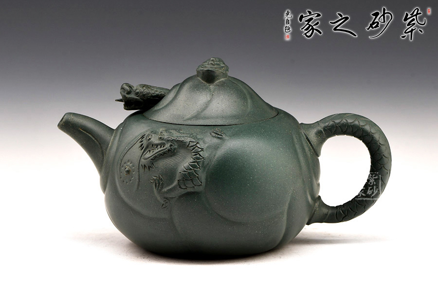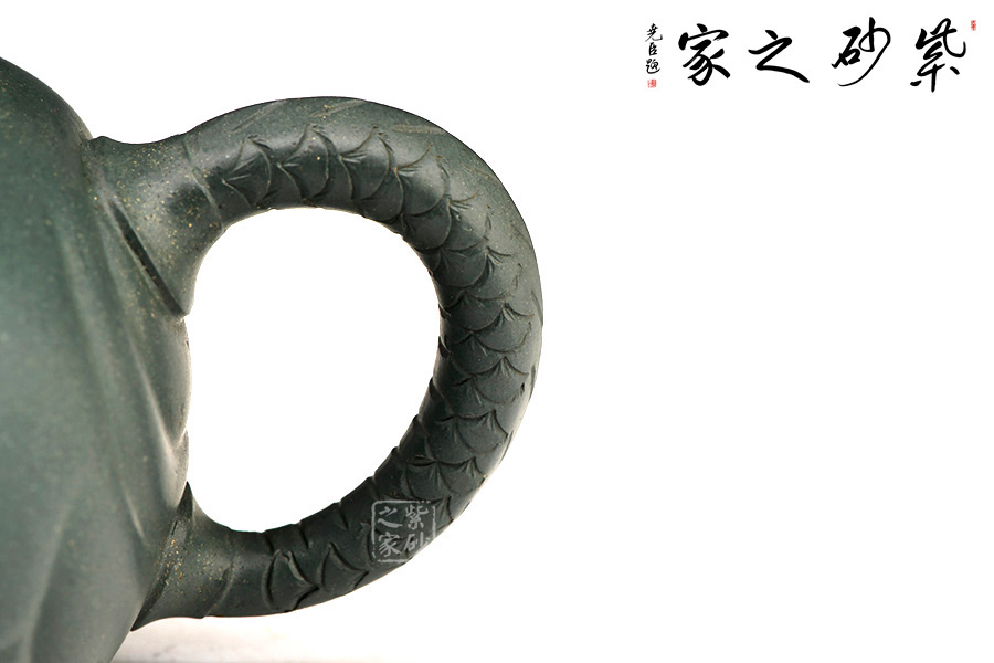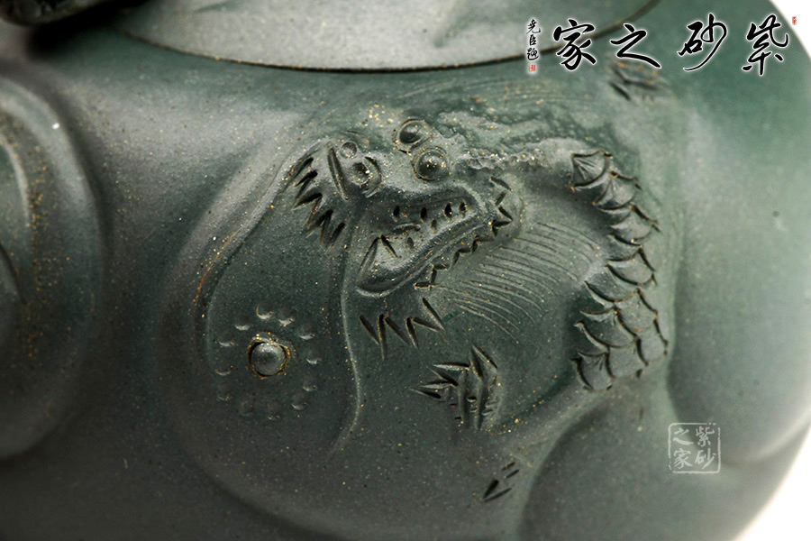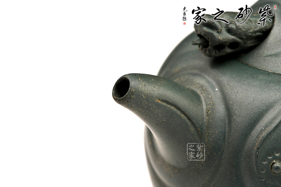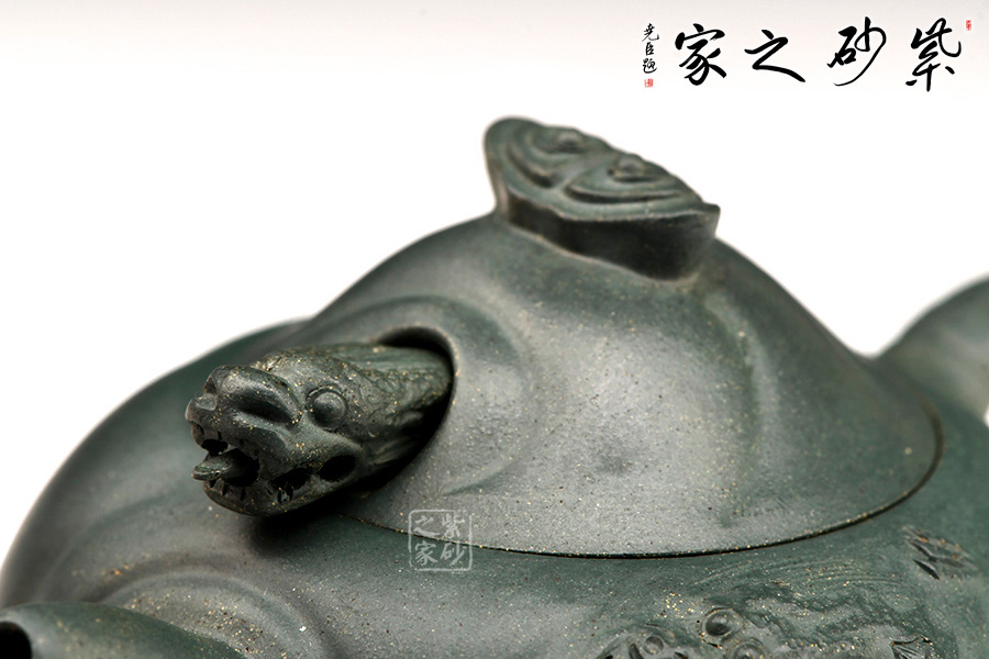 研高徐漢棠老師選用原礦墨綠泥手工制作。壺嘴彎流,壺把滿飾魚鱗紋;壺身為圓形,由幾塊規(guī)則的波浪組成,正面有巨龍?jiān)诓ɡ酥蟹瓭L,背面有金魚在波浪中游玩;壺蓋呈波濤涌起狀,有龍頭至正面探出,龍頭可伸縮,頂上如意型鈕。