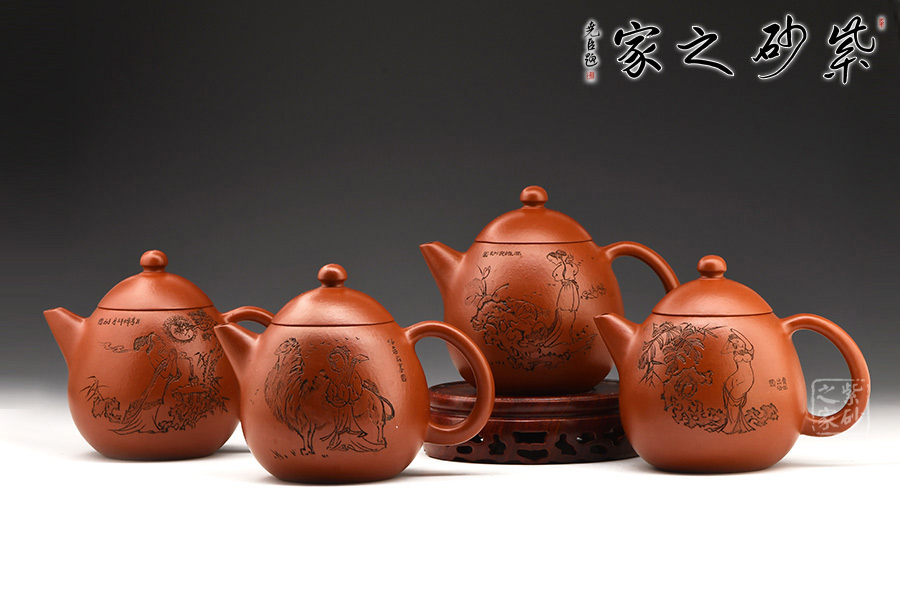 四把壺上刻有中國(guó)古代沉魚(yú)落雁、閉月羞花的四大美女,西施,王昭君,貂蟬,楊玉環(huán)。不論是發(fā)絲還是裙擺的褶皺都刻畫(huà)的一清二楚,足以顯示出老師的功底,贊嘆其篆刻功底之深,工藝之精妙!