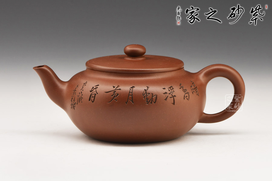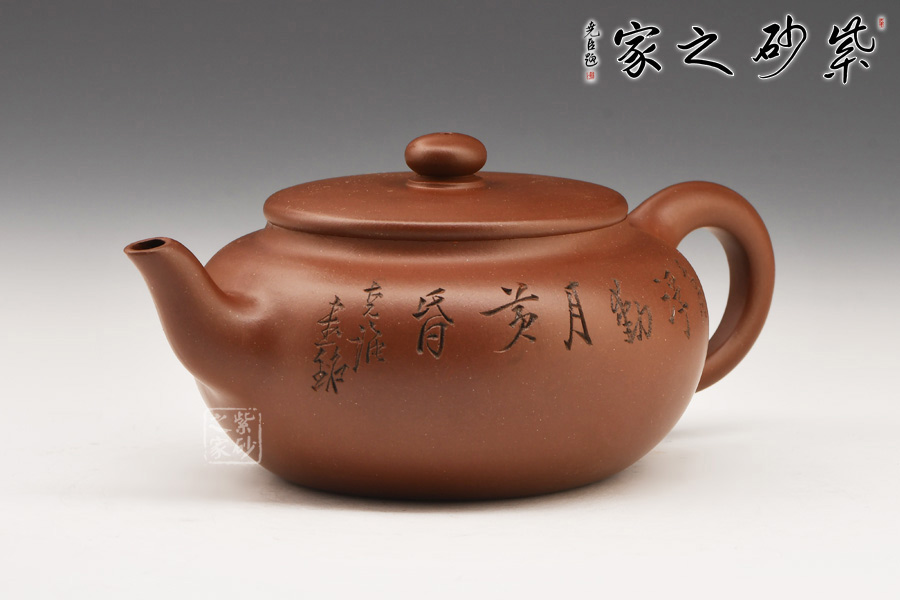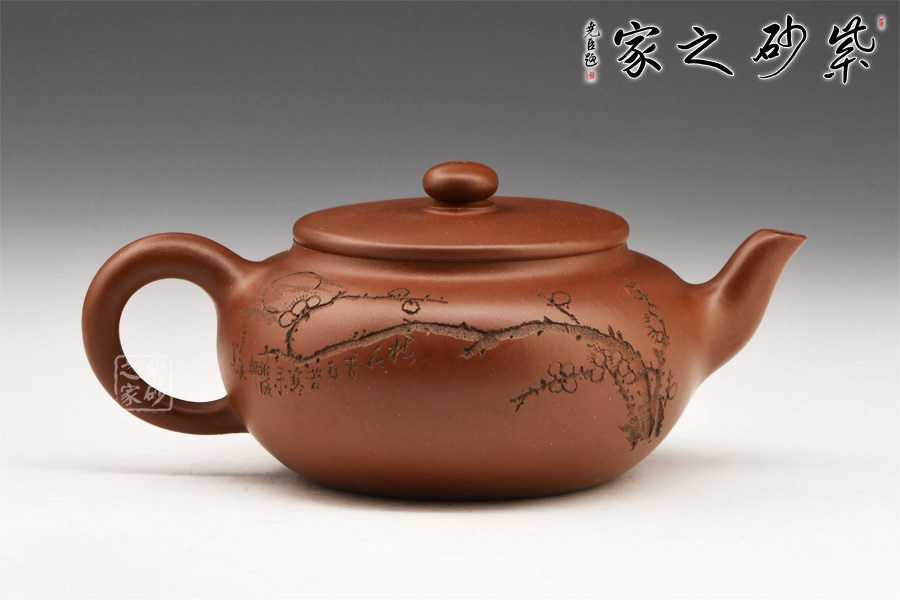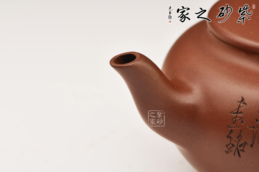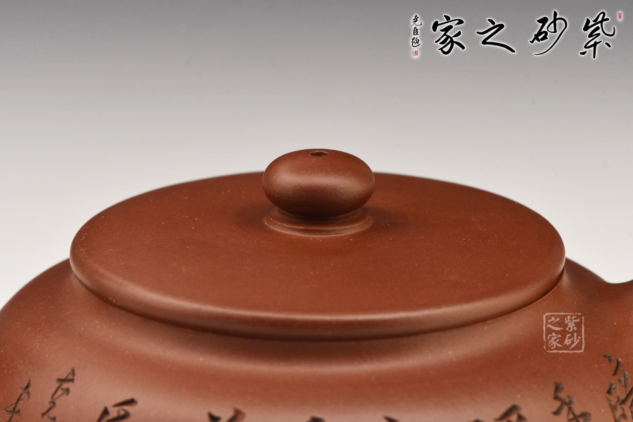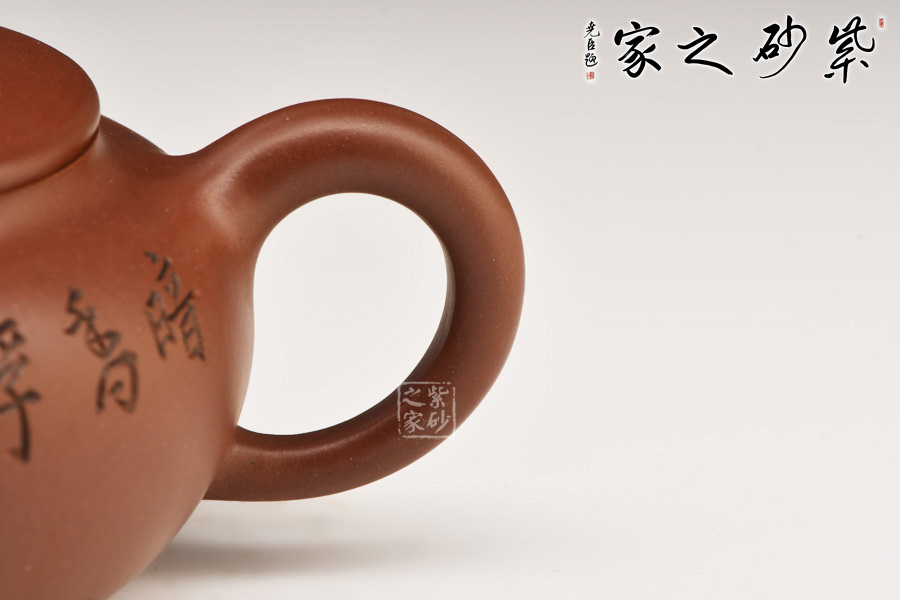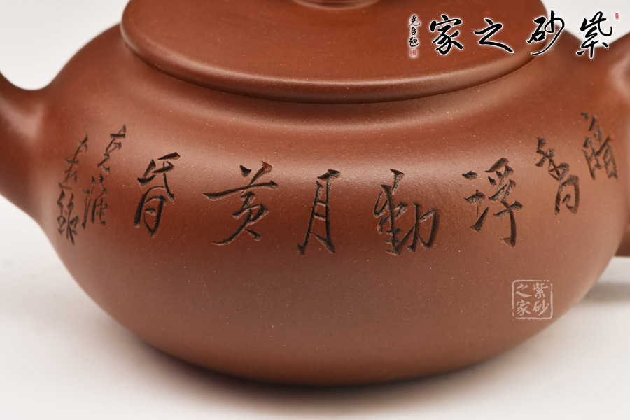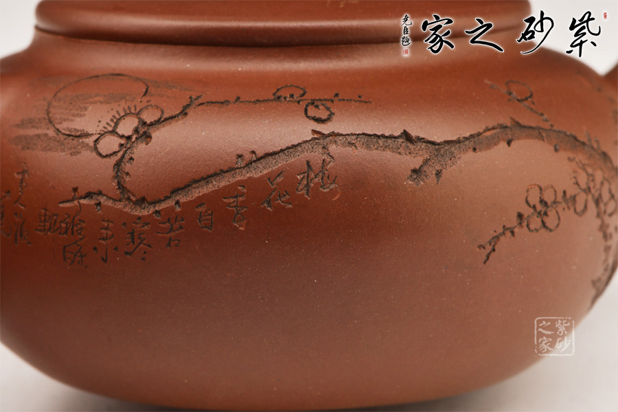 流把鈕均為暗接手法,與壺身宛若一體,可見功力。壺身刻繪梅花與“梅花香自苦寒來,暗香浮動(dòng)月黃昏”這些字相輔相成,別有一番意境。
