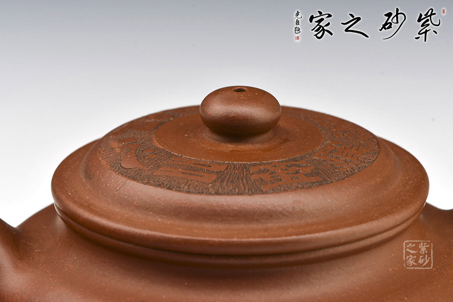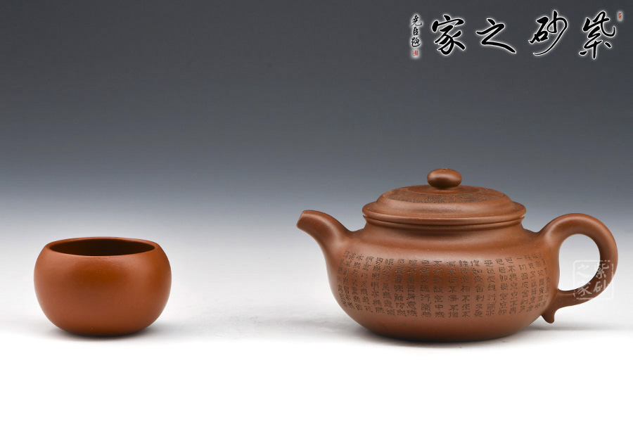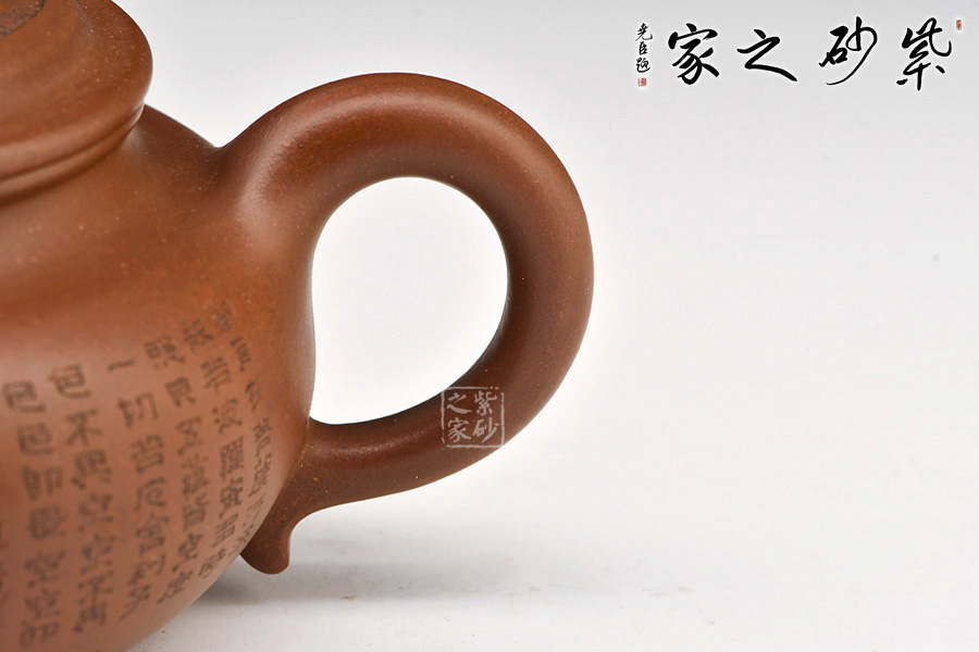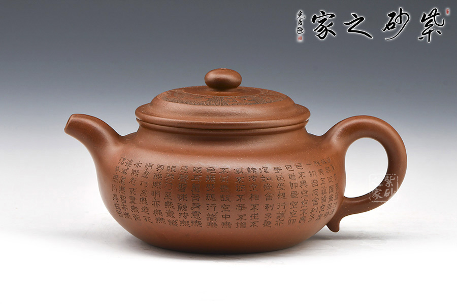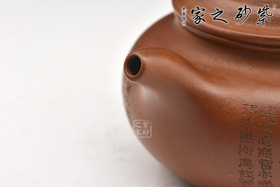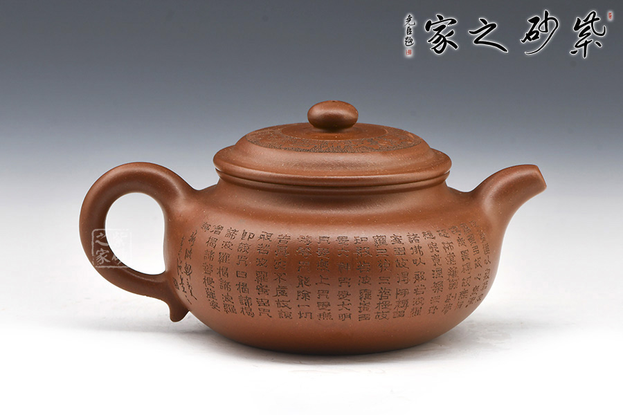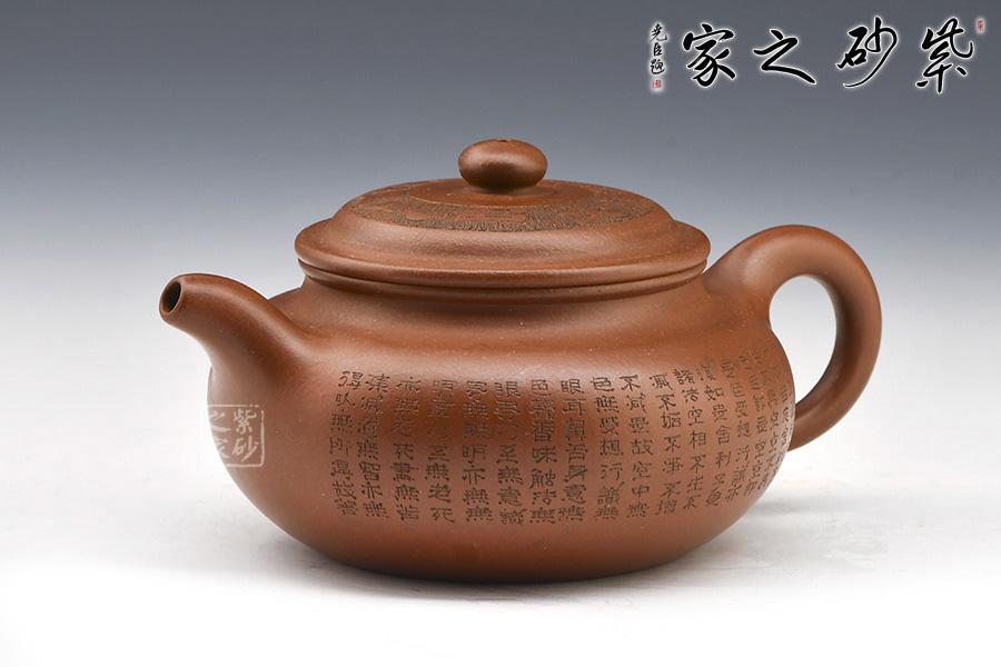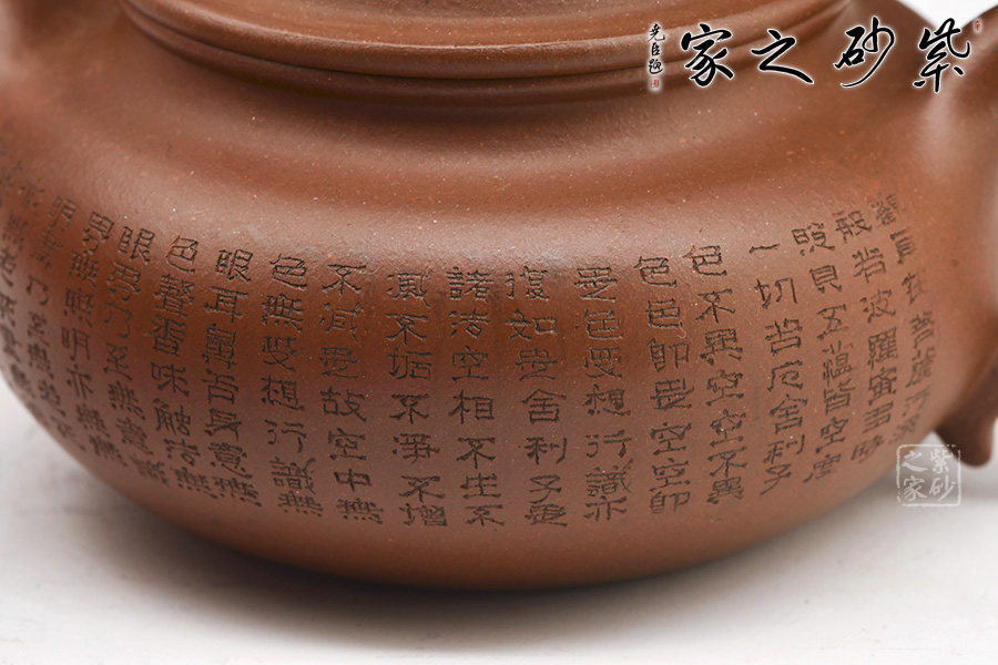 仿古壺:身扁、腹鼓、頸高、子母線壓蓋設(shè)計,蓋板平滑,壺蓋與口沿字母線吻合嚴密,合成圓線飽滿,扁鈕有力,虹鈕有勢,彎流胥出自然,圓圈把勻勢而起,下帶垂,富于靈動。整體骨肉亭勻,收展有度,有一氣呵成之暢。通體刻繪心經(jīng),充滿禪意。