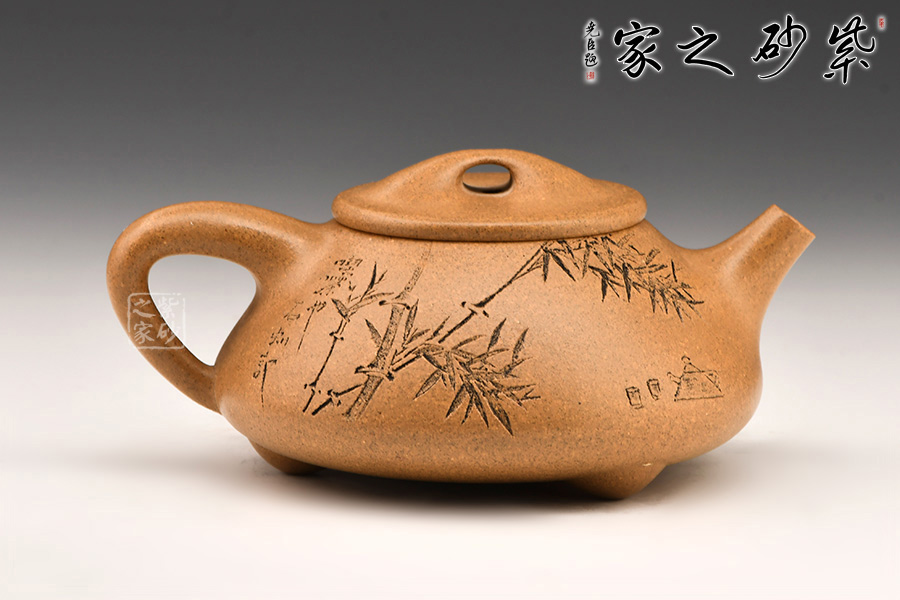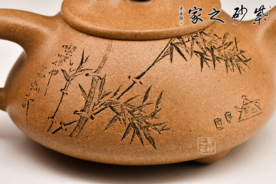 壺的造型為上小下大的圓臺(tái)形,把為上大下小的三角形。短直流,橋形蓋鈕,底有三扁圓足。壺身和壺蓋銜接緊密,滿水后不外溢,刻有竹子和文字。線條流暢,氣韻生動(dòng),充滿了紫砂壺的神韻和魅力。