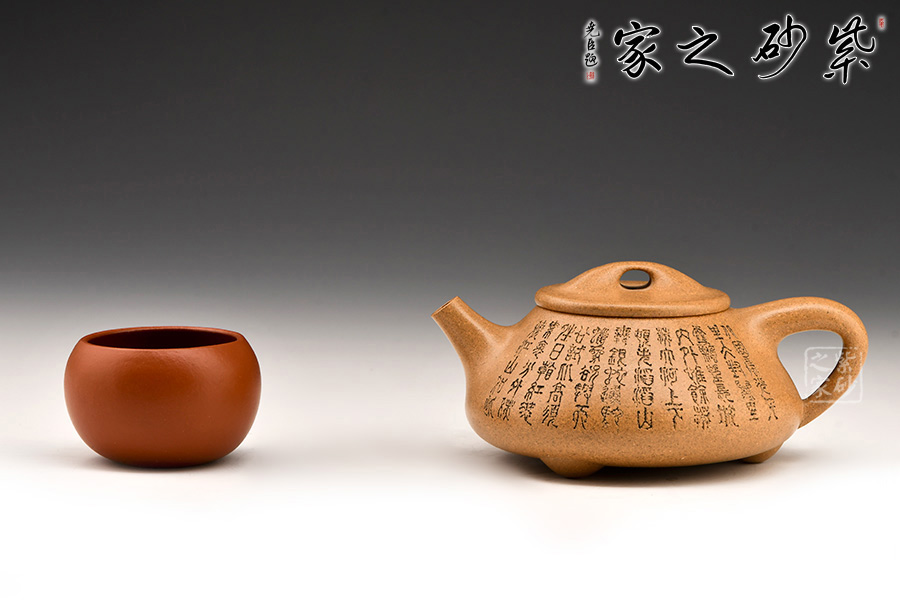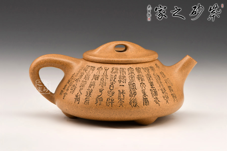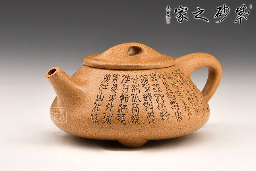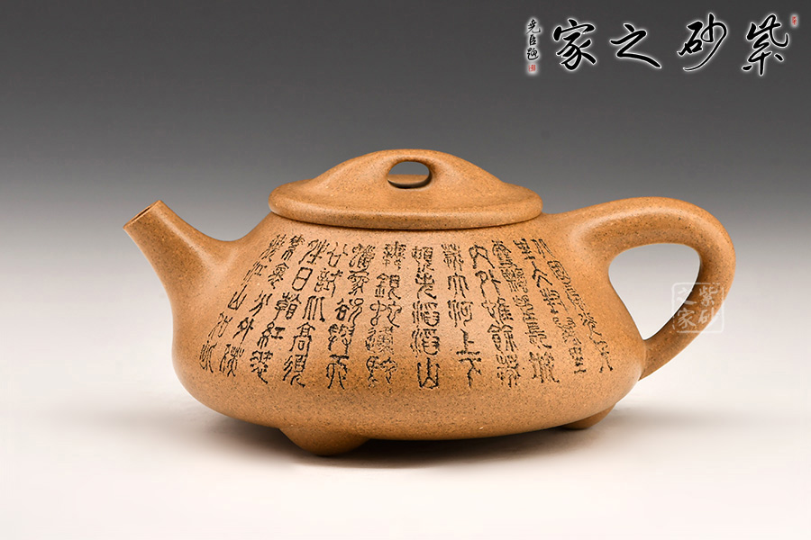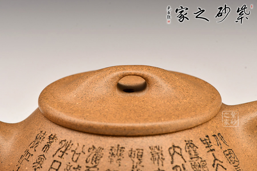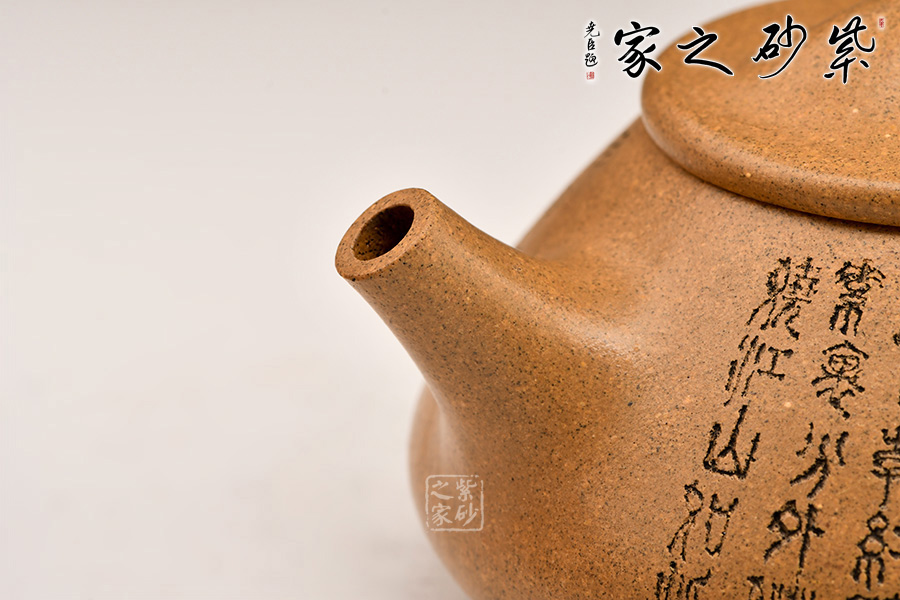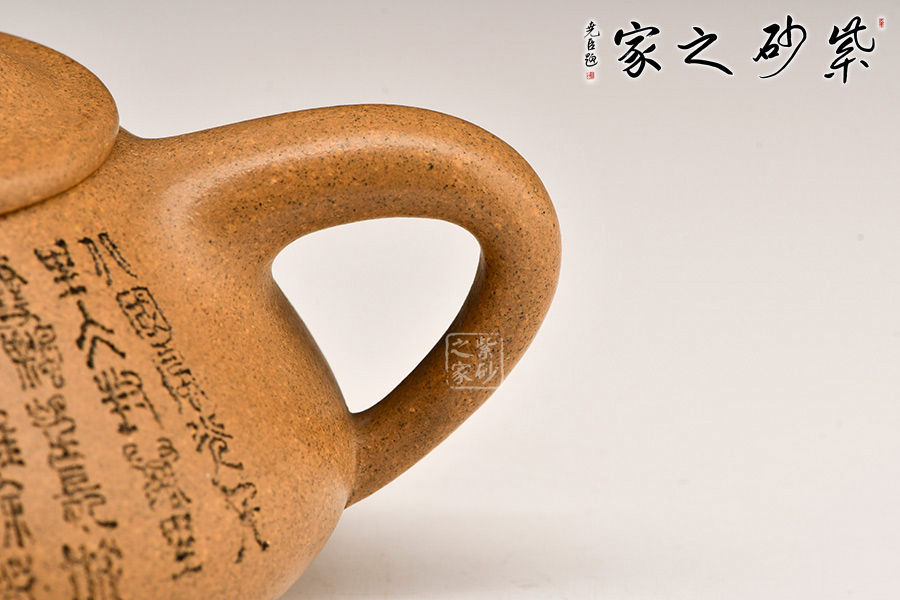 壺的造型為上小下大的圓臺形,把為上大下小的三角形。短直流,橋形蓋鈕,底有三扁圓足。壺身和壺蓋銜接緊密,滿水后不外溢,周身刻有文字。采用黃金段泥料,線條流暢,氣韻生動(dòng),充滿了紫砂壺的神韻和魅力