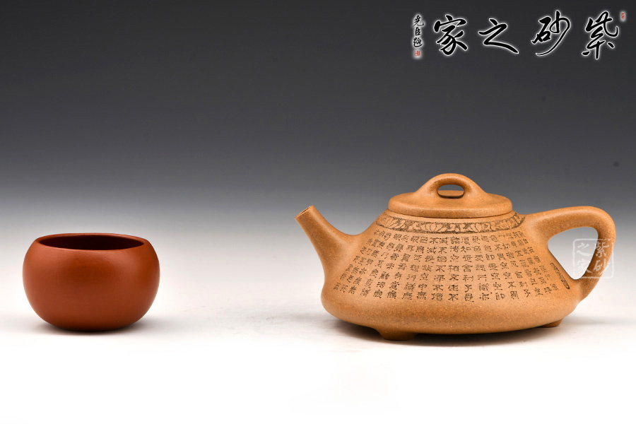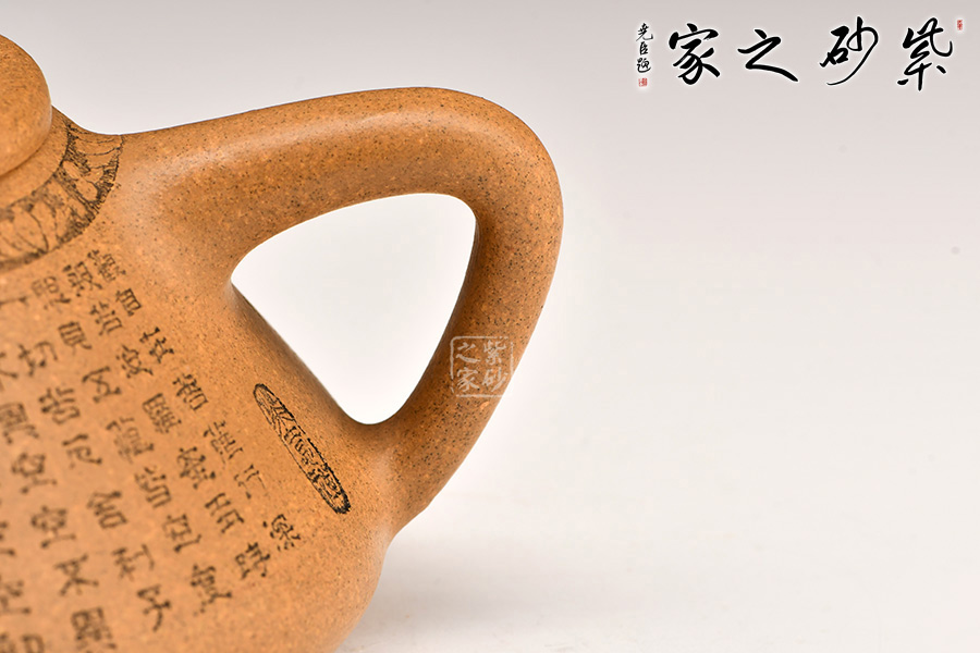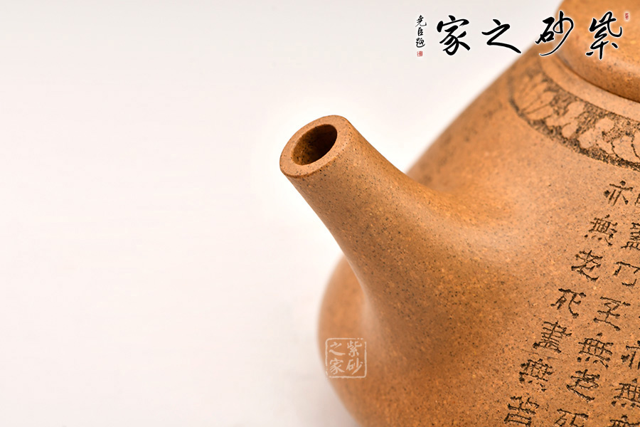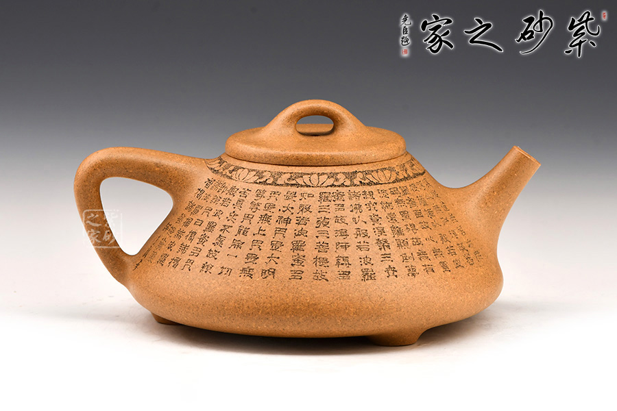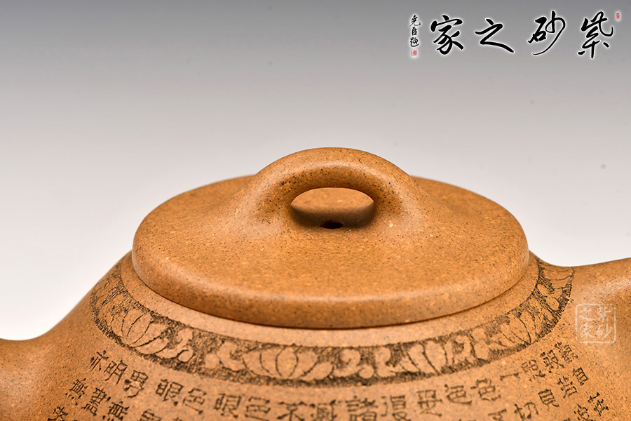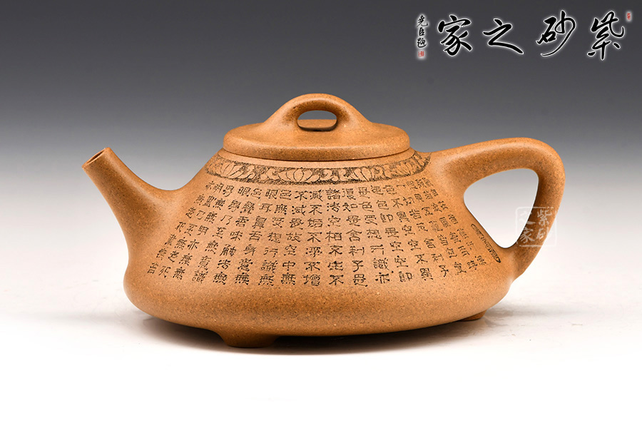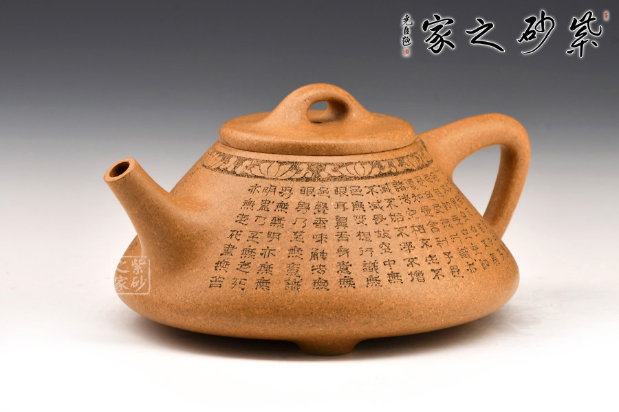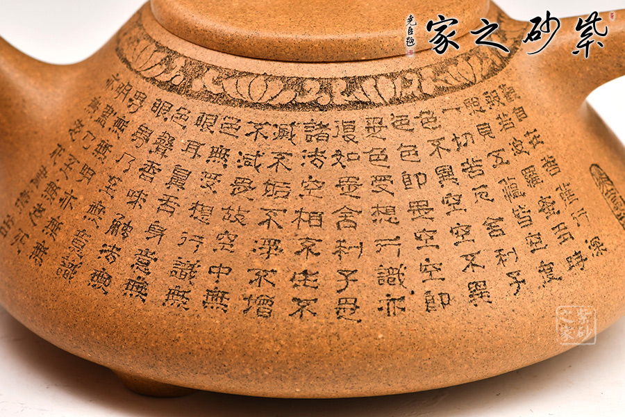 壺的造型為上小下大的圓臺形,把為上大下小的三角形。短直流,橋形蓋鈕,底有三扁圓足。壺身和壺蓋銜接緊密,滿水后不外溢,周身刻有心經(jīng)。線條流暢,氣韻生動,充滿了紫砂壺的神韻和魅力。