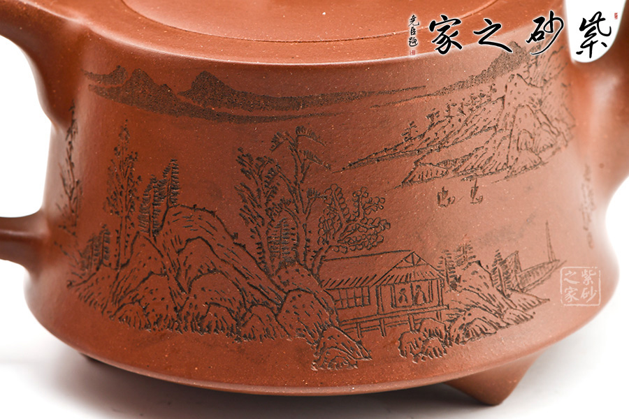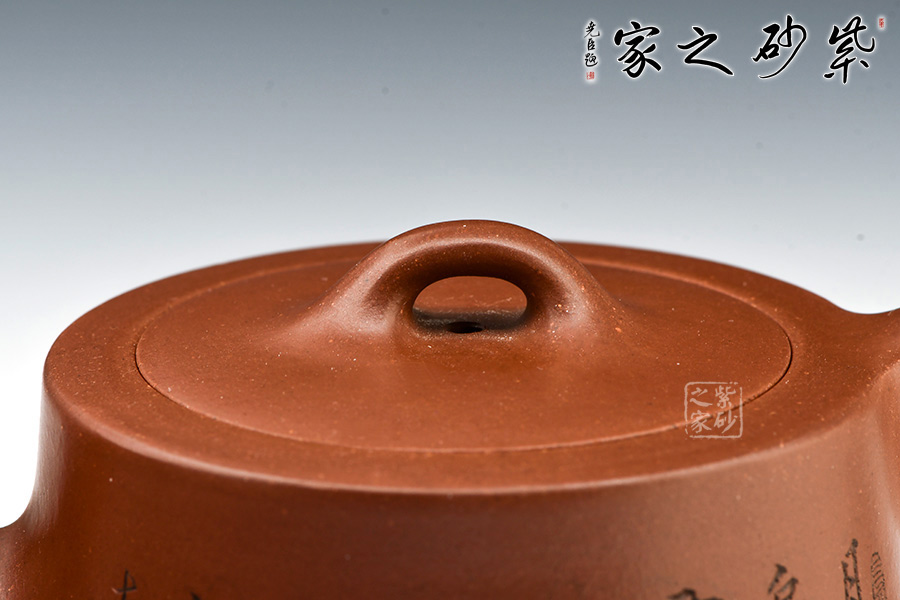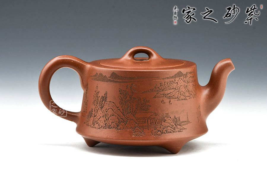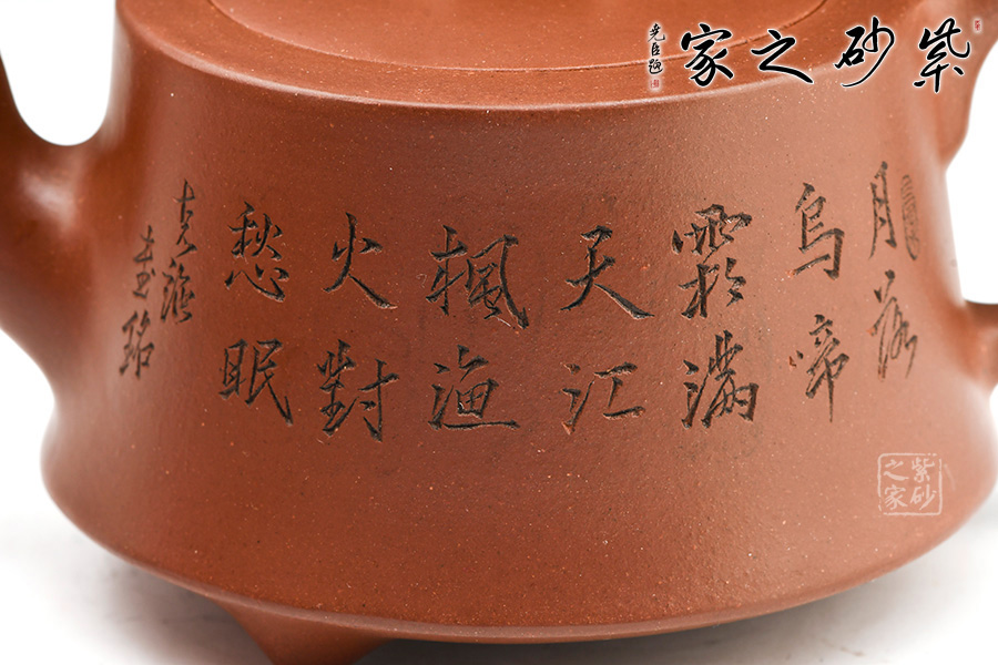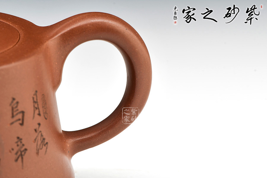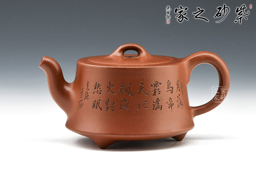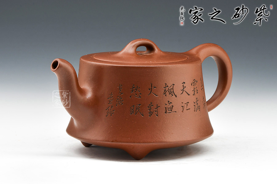 三足底,壺身呈梯形,下邊往外延展,左側(cè)暗接一彎嘴,隨身勢,出水流暢;右側(cè)暗接圈把,彎曲有致,飄逸瀟灑。嵌蓋設(shè)計,蓋如大镲,圓形立柱為鈕。整體造型穩(wěn)重而大方。