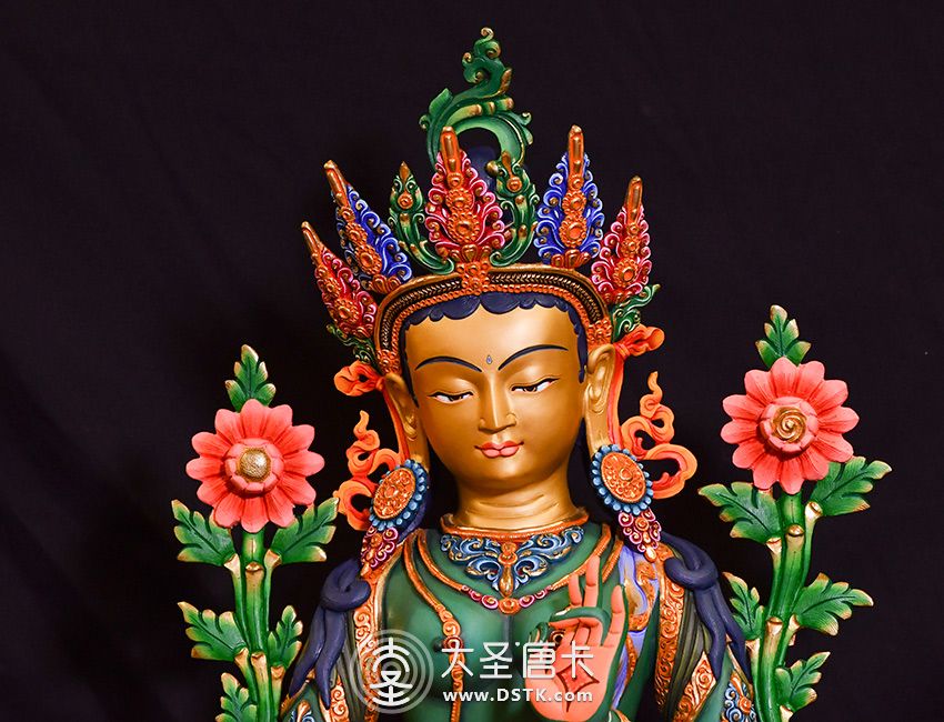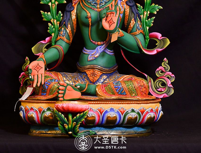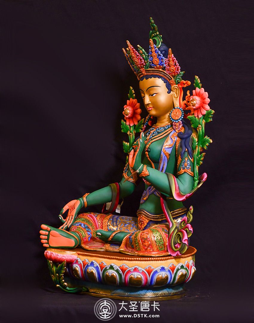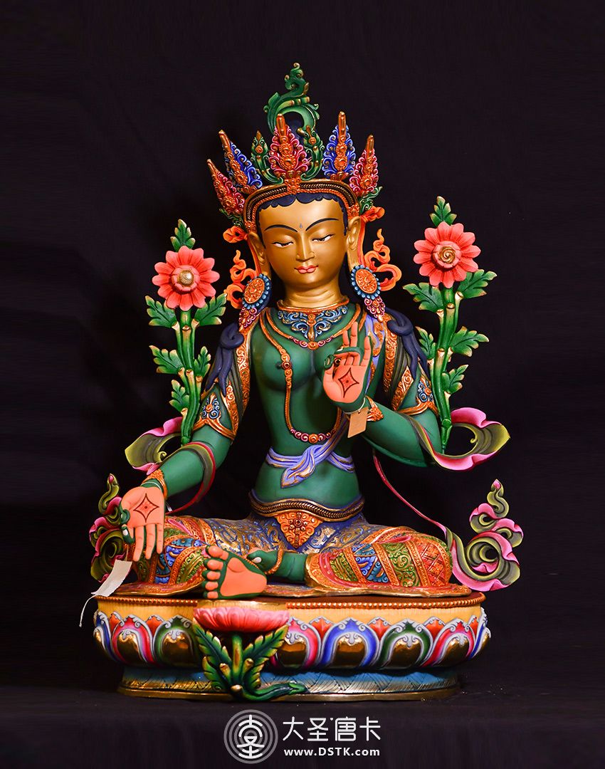 綠度母,藏語叫“卓姜”,是從觀音菩薩的眼淚中化現出來的,所以最慈悲。綠度母為所有度母之主尊,總攝其余二十尊化身之所有功德。因其救度之迅速、摧滅魔業之勇猛,故又稱作“救度速勇母”。