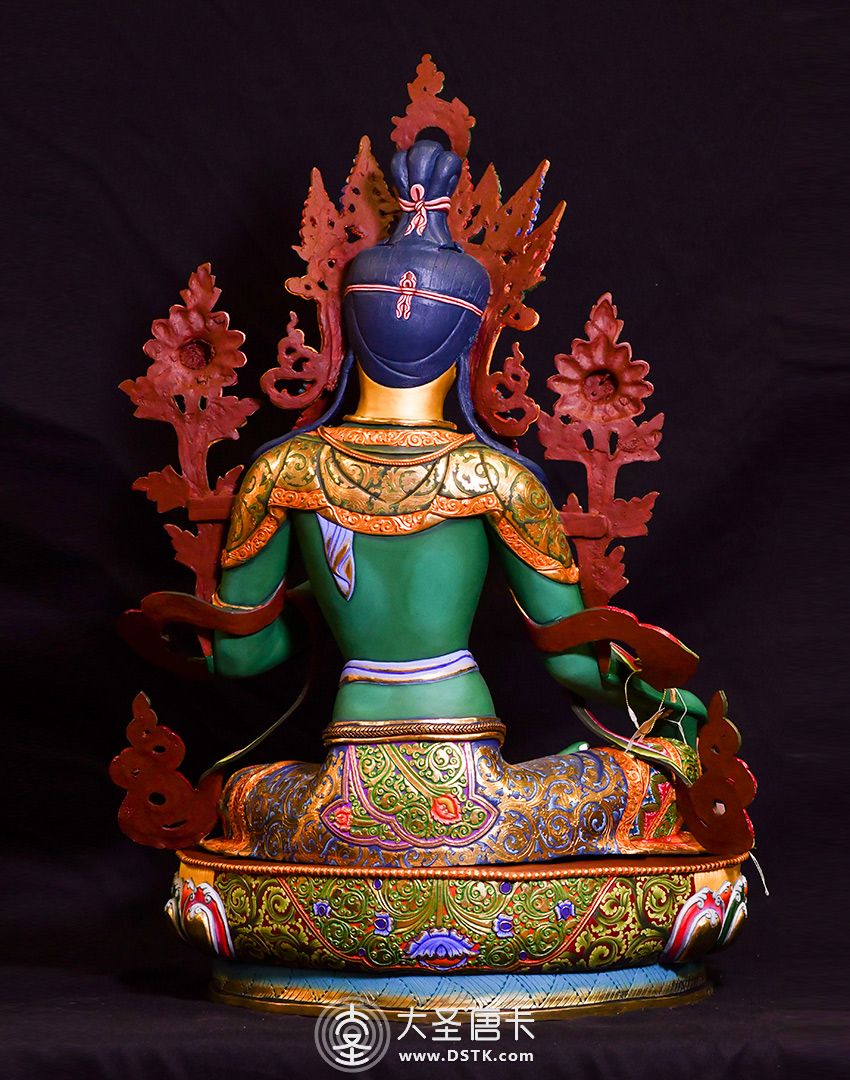 【綠度母的法相】綠度母造像為菩薩裝,全身呈翠綠色,是藏傳佛教的事業部之色,亦即不空成就佛之身色。一面二臂,面容姣好,二八妙齡,身材纖細,美貌絕倫。頭戴小五佛寶冠,身子放射出虹光,身佩各種瓔珞珠寶,著各色天衣,下身重裙,其形象華貴美麗,慈祥莊嚴。