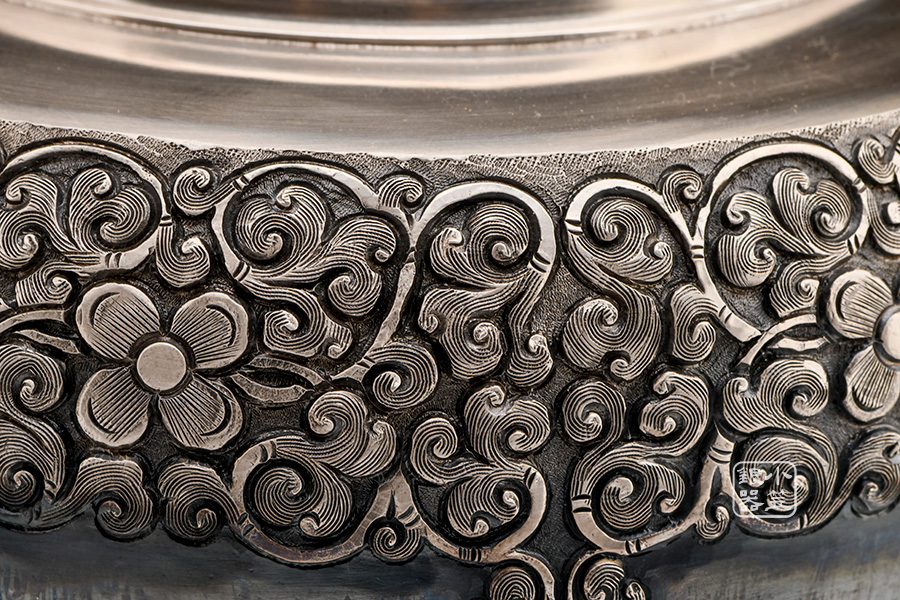銀壺的制作是段六一對(duì)小爐匠傳統(tǒng)的傳承,也是金屬工藝的集大成。一張打、片打出等技術(shù),鏨刻、雕花、成形等工藝看似簡(jiǎn)單,實(shí)則需要深厚的工藝基礎(chǔ)。銀板多半毫則太后,銀板少半毫則太薄。收口不到位則銀壺出水不流暢,鏨刻少了藝術(shù)功底則暗淡無(wú)光。從佛像到佛塔,從藏刀到到壁畫,段六一40年來(lái)對(duì)工藝的苛求最終在銀壺上得以集合。正是由于工藝的繁復(fù)和精準(zhǔn),手工藝人們才說(shuō)“做好了銀壺,才是一個(gè)合格的手藝人”。